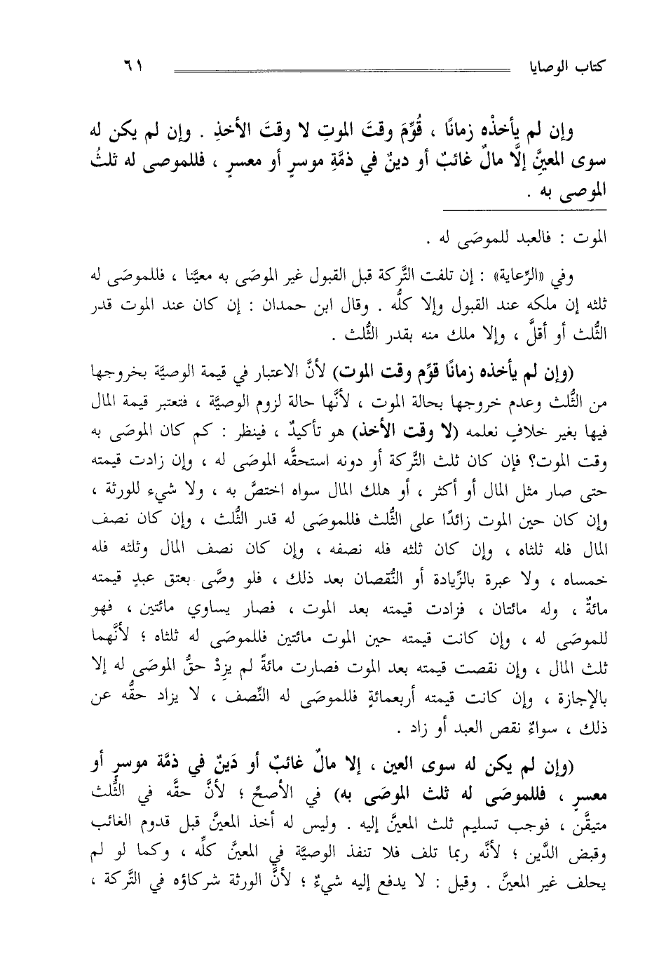 وان لم يأخذه زمانا قوم وقت الموت لا وقت الأخذ وان لم يكن له سوى المعين إلا مال غائب او دين في ذمة موسر أو معسر فللموصى له ثلث الموصى به.