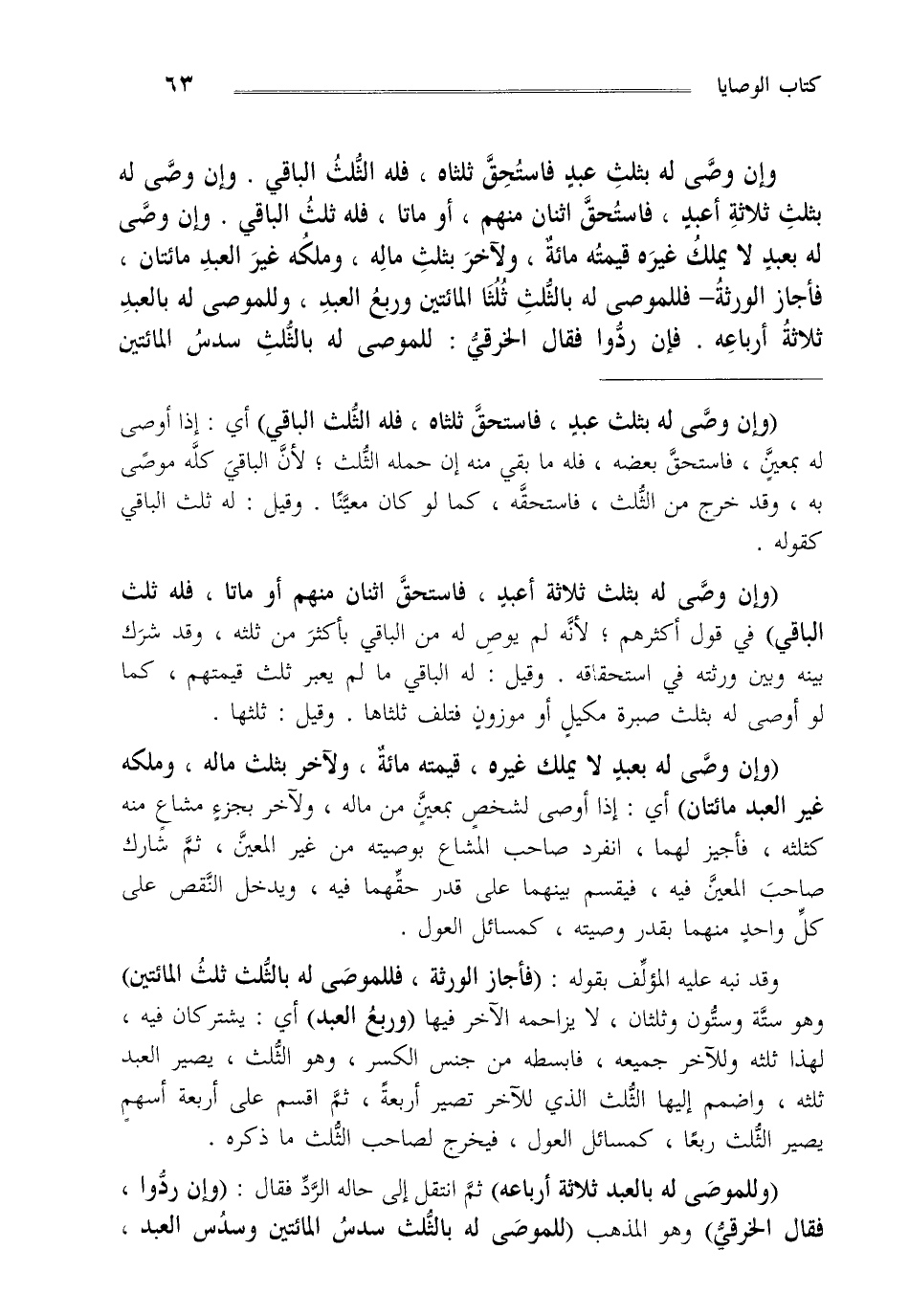 "وللموصى له بالعبد ثلاثة أرباعه" ثم انتقل إلى حاله الرد فقال: "وإن ردوا فقال الخرقي" وهو المذهب "للموصى له بالثلث بينها المائتين وسدس العبد