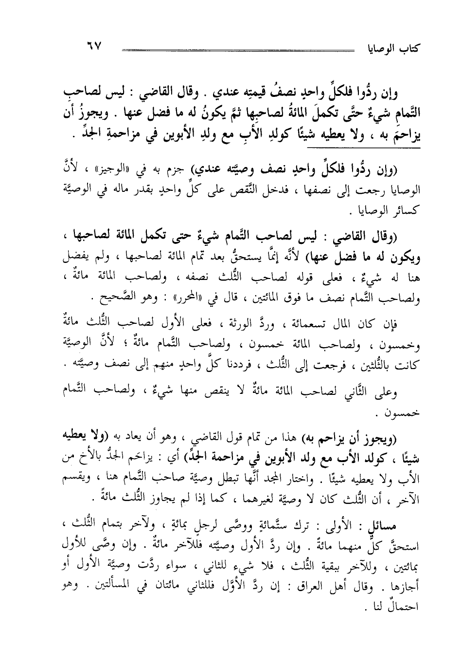 وان ردوا فلكل واحد نصف قيمته عندي و قال القاضي: ليس لصاحب التمام شيء حتى تكمل المائة لصاحبها ثم يكون له ما فضل عنها ويجوز ان يزاحم به ولا يعطيه شيئا كولد الأب مع ولد الابوين في مزاحمة الجد.
