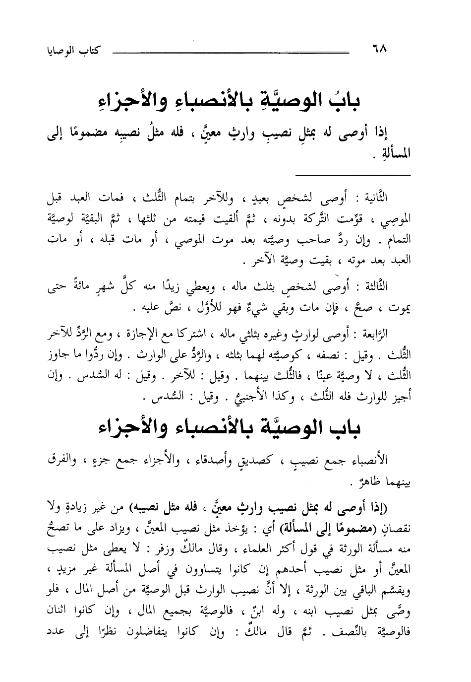 "إذا أوصى له بمثل نصيب وارث معين فله مثل نصيبه" من غير زيادة ولا نقصان "مضموما إلى المسألة" أي: يؤخذ مثل نصيب المعين ويزاد على ما تصح منه مسألة الورثة في قول أكثر العلماء وقال مالك وزفر لا يعطى مثل نصيب المعين أو مثل نصيب أحدهم إن كانوا يتساوون في أصل المسألة غير مزيد ويقسم الباقي بين الورثة إلا أن نصيب الوارث قبل الوصية من أصل المال فلو وصى بمثل نصيب ابنه وله ابن فالوصية بجميع المال وإن كانوا اثنان فالوصية بالنصف ثم قال مالك وإن كانوا يتفاضلون نظرا إلى عدد