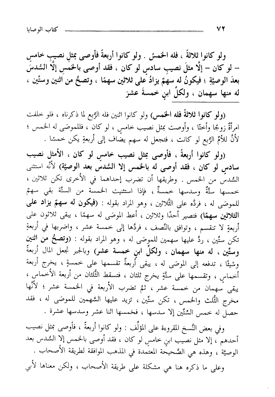 "ولو كانوا أربعة فأوصى بمثل نصيب خامس لو كان الامثل نصيب سادس لو كان فقد أوصى له بالخمس إلا السدس بعد الوصية" لأنه استثنى السدس من الخمس وطريقها أن تضرب إجداهما في الأخرى تكن ثلاثين خمسها ستة وسدسها خمسة فإذا استثنيت الخمسة من الستة بقي سهم للموصي له فرده على الثلاثين وهو المراد بقوله: "فيكون له سهم يزاد على الثلاثين سهما" فتصير أحدا وثلاثين أعط الموصى له سهما يبقى ثلاثون على أربعة لا تنقسم وتوافق بالنصف فردها إلى خمسة عشر واضربها في أربعة تكن ستين رد عليها سهمين للموصى له وهو المراد بقوله: "وتصح من اثنين وستين له منها سهمان ولكل ابن خمسة عشر" وبالجبر تجعل المال أربعة وشيئا تدفعه إلى الموصى له يبقى أربعة تقسمها على خمسة يخرج أربعة أخماس وتقسمها على ستة يخرج ثلثان فتسقط الثلثان من أربعة الأخماس يبقى سهمان من خمسة عشر ثم تضرب الأربعة في الخمسة عشر لأنها مخرج الثلث والخمس تكن ستين تزيد عليها السهمين للموصى له فقد حصل له خمس الستين إلا سدسها فخمسها اثنا عشر وسدسها عشرة.