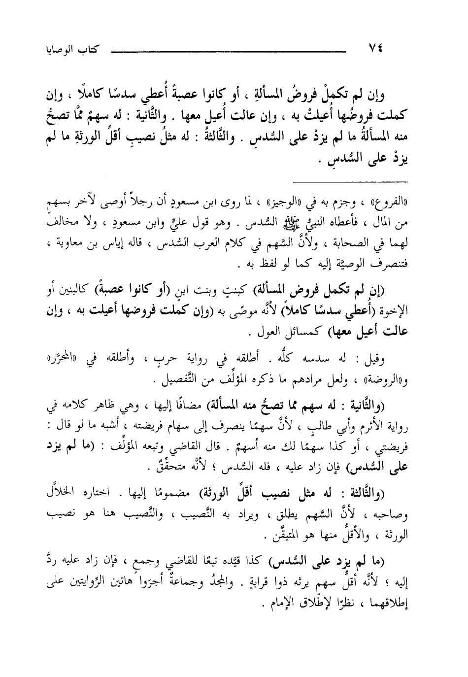 "إن لم تكمل فروض المسألة" كبنت وبنت ابن "أو كانوا عصبة" كالبنين أو الإخوة "أعطي سدسا كاملا" لأنه موصى به "وإن كملت فروضها أعيلت به وإن عالت أعيل معها" كمسائل العول.