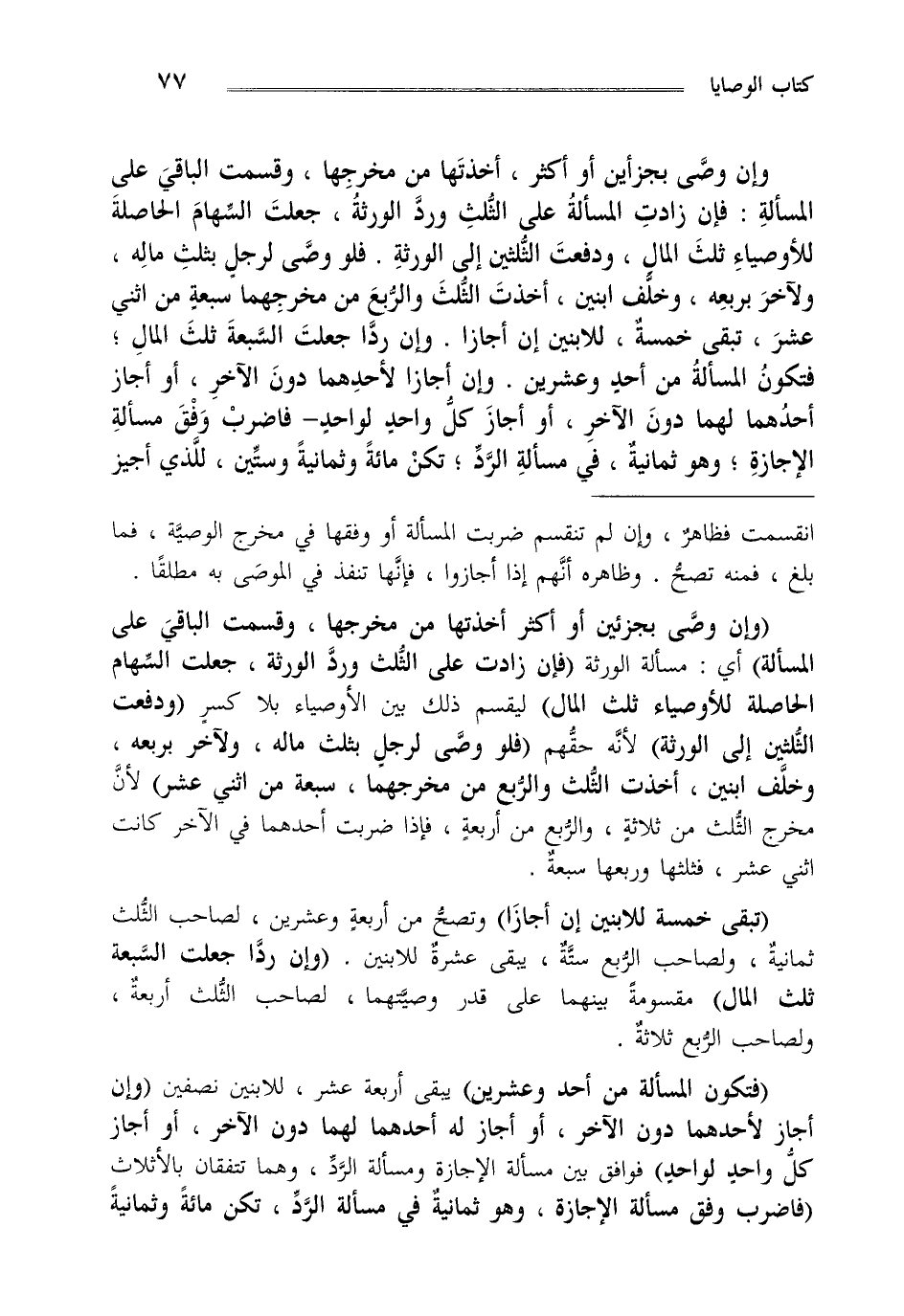 "فتكون المسألة من أحد وعشرين" يبقى أربعة عشر للابنين نصفين "وإن أجاز لأحدهما دون الآخر أو أجاز له أحدهما لهما دون الآخر أو أجاز كل واحد لواحد" فوافق بين مسألة الإجازة ومسألة الرد وهما تتفقان بالأثلاث "فاضرب وفق مسألة الإجازة وهو ثمانية في مسألة الرد تكن مائة وثمانية