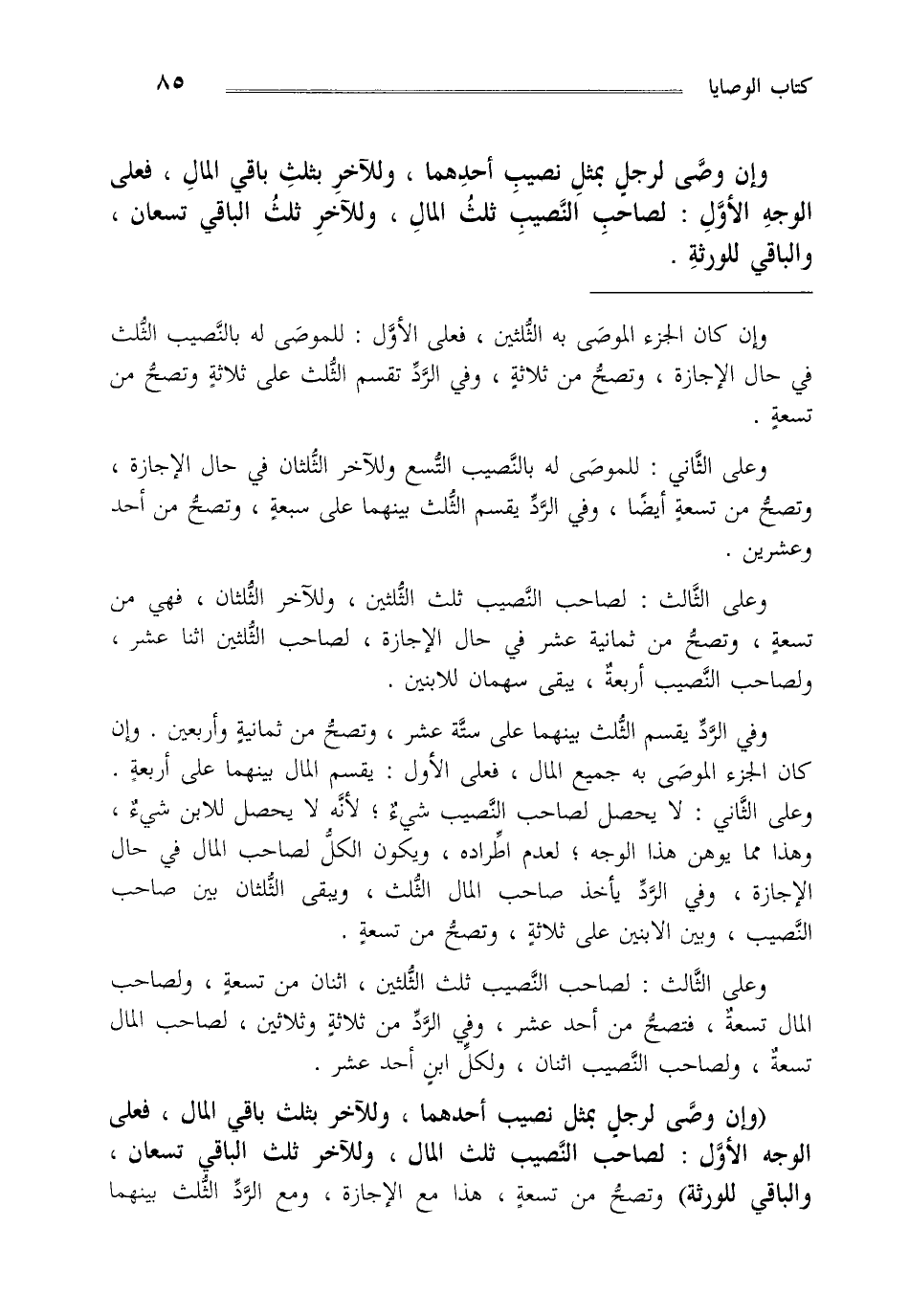 وفي الرد يقسم الثلث بينهما على ستة عشر وتصح من ثمانية وأربعين وإن كان الجزء الموصى به جميع المال فعلى الأول: يقسم المال بينهما على أربعة وعلى الثاني: لا يحصل لصاحب النصيب شيء لأنه لا يحصل للابن شيء وهذا مما يوهن هذا الوجه لعدم اطراده ويكون الكل لصاحب المال في حال الإجازة وفي الرد يأخذ صاحب المال الثلث ويبقى الثلثان بين صاحب النصيب وبين الابنين على ثلاثة وتصح من تسعة.