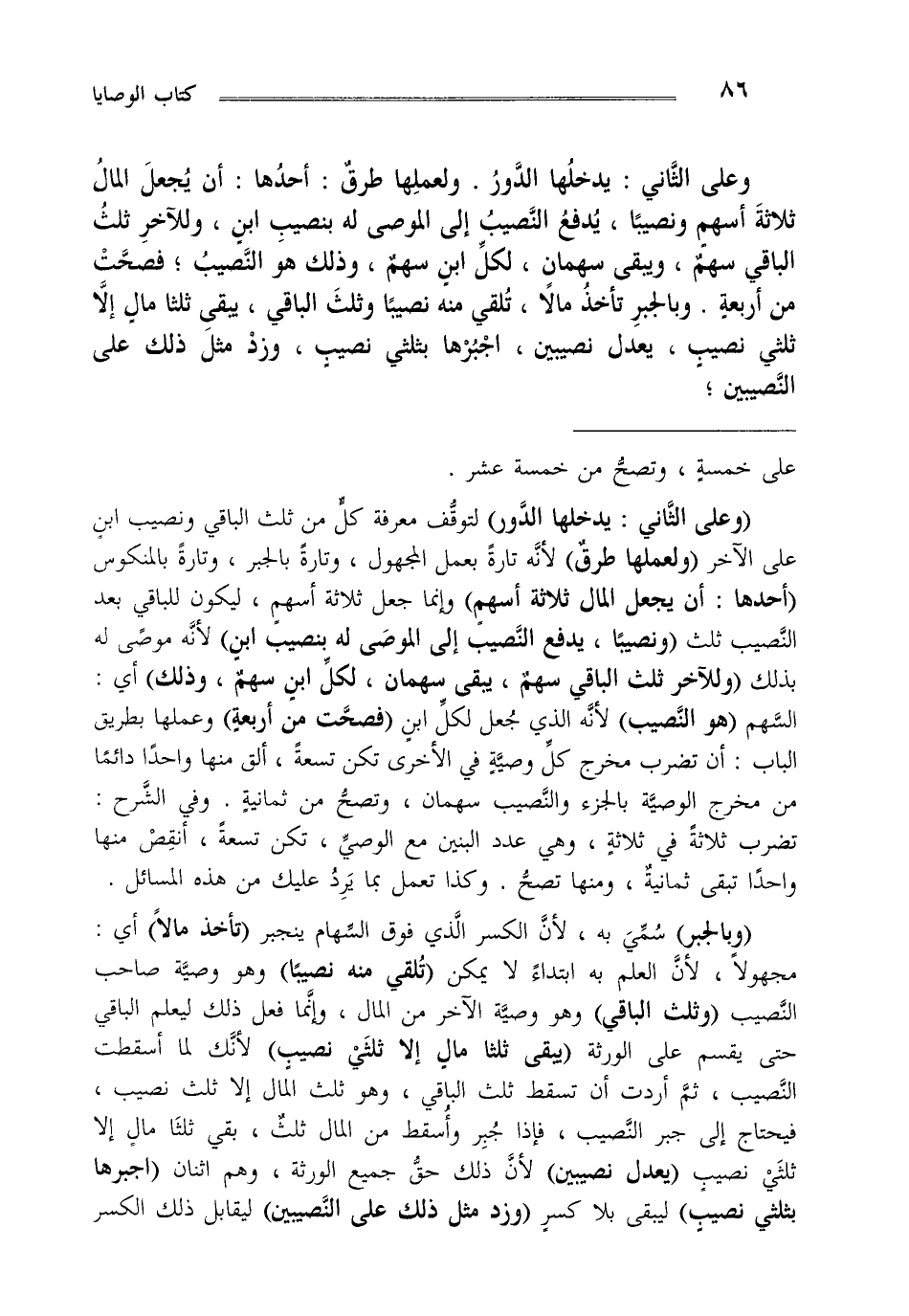 "وعلى الثاني" يدخلها الدور" لتوقف معرفة كل من ثلث الباقي ونصيب ابن على الآخر "ولعملها طرق" لأنه تارة بعمل المجهول وتارة بالجبر وتارة بالمنكوس "أحدها: أن يجعل المال ثلاثة أسهم" وإنما جعل ثلاثة أسهم ليكون للباقي بعد النصيب ثلث "ونصيبا يدفع النصيب إلى الموصى له بنصيب ابن" لأنه موصى له بذلك "وللآخر ثلث الباقي سهم يبقى سهمان لكل ابن سهم وذلك" أي: السهم هو النصيب لأنه الذي جعل لكل ابن "فصحت من أربعة" وعملها بطريق الباب أن تضرب مخرج كل وصية في الأخرى تكن تسعة ألق منها واحدا دائما من مخرج الوصية بالجزء والنصيب سهمان وتصح من ثمانية وفي الشرح تضرب ثلاثة في ثلاثة وهي عدد البنين مع الوصي تكن تسعة أنقص منها واحدا تبقى ثمانية ومنها تصح وكذا تعمل بما يرد عليك من هذه المسائل.