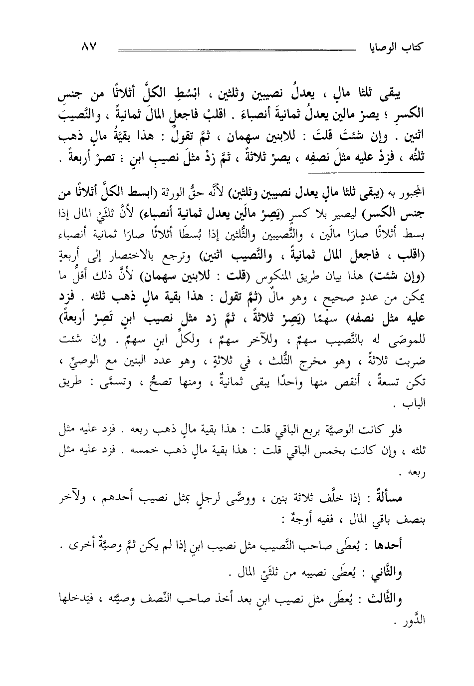 يبقى ثلثا مال يعدل نصيبين وثلثين ابسط الكل أثلاثا من جنس الكسر يصر مالين بعدل ثمانية أنصباء اقلب فاجعل المال ثمانية والنصيب اثنين وإن شئت قلت للابنين سهمان ثم تقول هذا بقية مال ذهب ثلثه فزد عليه مثل نصفه يصر ثلاثة ثم زد مثل نصيب ابن تصر أربعة،
