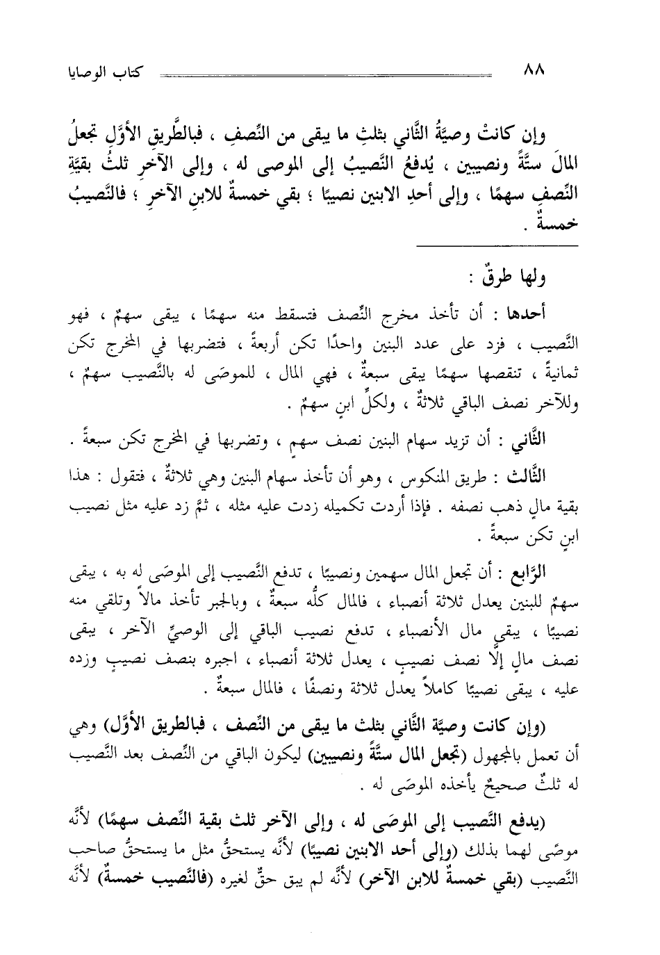 الرابع: أن تجعل المال سهمين ونصيبا تدفع النصيب إلى الموصى له به يبقى سهم للبنين يعدل ثلاثة أنصباء فالمال كله سبعة وبالجبر تأخذ مالا وتلقي منه نصيبا يبقى مال الأنصباء تدفع نصيب الباقي إلى الوصي الآخر يبقى نصف مال إلا نصف نصيب بعدل ثلاثة أنصباء اجبره بنصف نصيب وزده عليه يبقى نصيبا كاملا يعدل ثلاثة ونصفا فالمال سبعة.