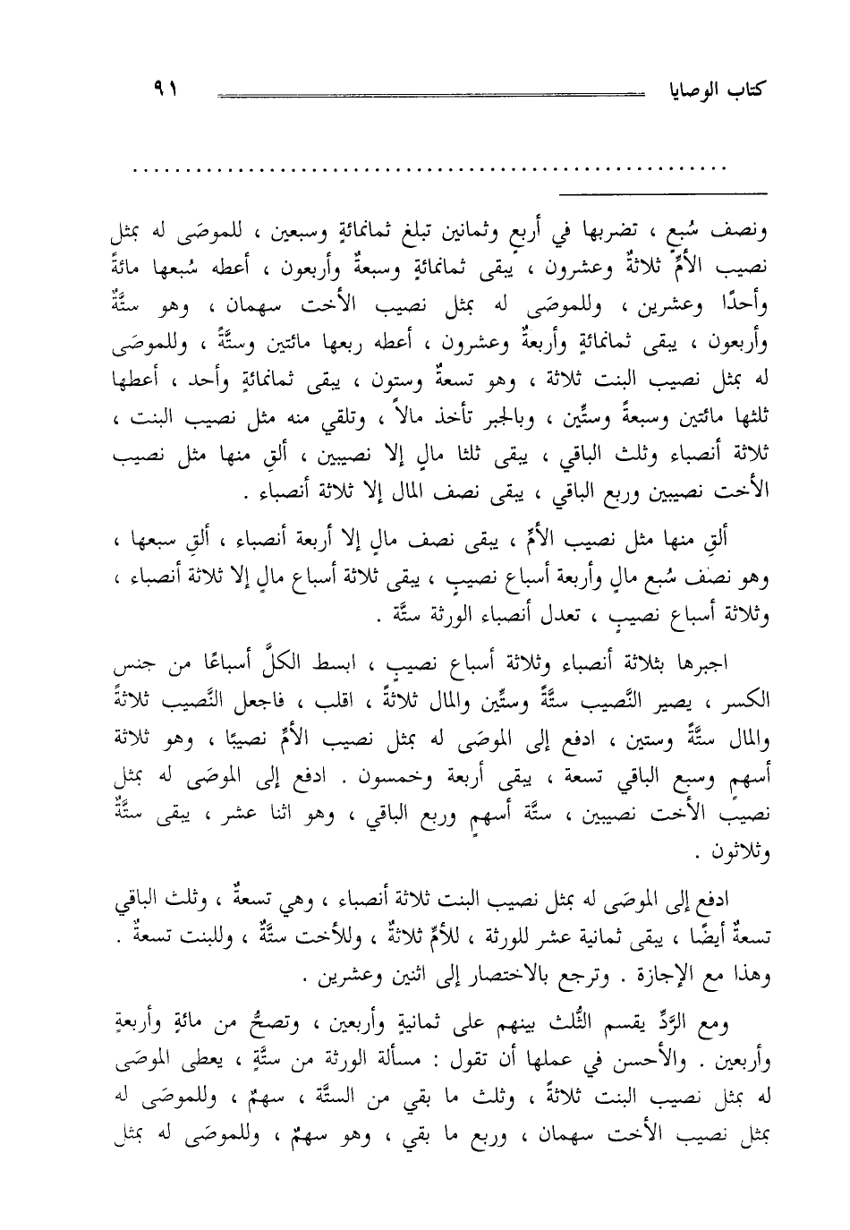ونصف سبع تضربها في أربع وثمانين تبلغ ثمانمائة وسبعين للموصى له بمثل نصيب الأم ثلاثة وعشرون يبقى ثمانمائة وسبعة وأربعون أعطه سبعها مائة واحدا وعشرين وللموصى له بمثل سهمان وهو ستة وأربعون يبقى ثمانمائة وأربعة وعشرون أعطه ربعها مائتين وستة وللموصى له بمثل نصيب البنت ثلاثة وهو تسعة وستون يبقى ثمانمائة وأحد أعطها ثلثها مائتين وسبعة وستين وبالجبر تأخذ مالا وتلقي منه مثل نصيب البنت ثلاثة أنصباء وثلث الباقي يبقى ثلثا مال إلا نصيبين ألق منها مثل نصيبين وربع الباقي يبقى نصف المال إلا ثلاثة أنصباء.