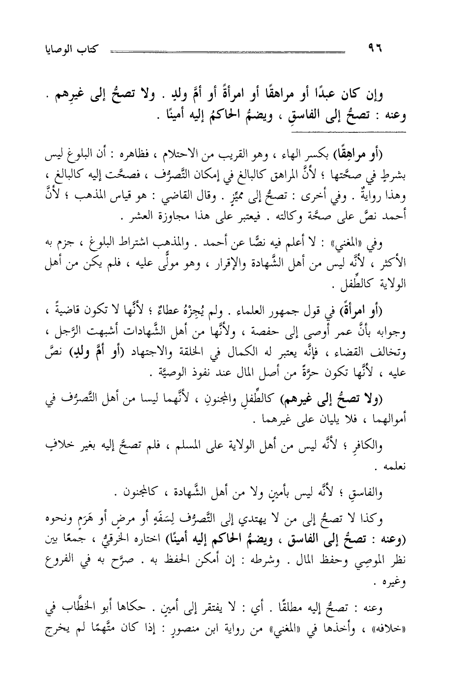 وكذا لا تصح إلى من لا يهتدي إلى التصرف لسفه أو مرض أو هرم ونحوه "وعنه: تصح إلى الفاسق ويضم الحاكم إليه أمينا" اختاره الخرقي جمعا بين نظر الموصي وحفظ المال وشرطه إن أمكن الحفظ به صرح به في الفروع وغيره.