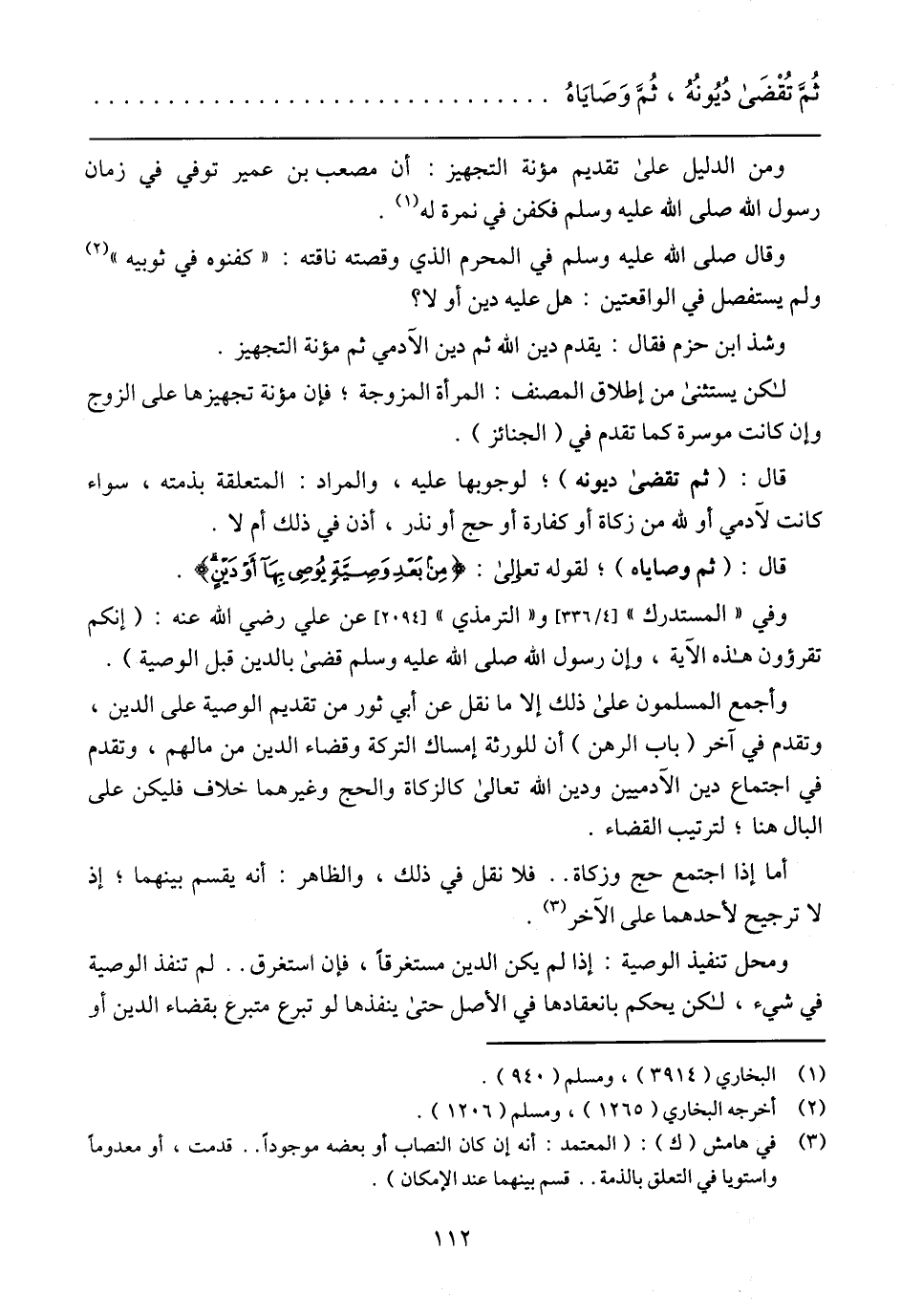ثُمَّ تُقْضَى دُيُونُهُ، ثُمَّ وَصَايَاهُ