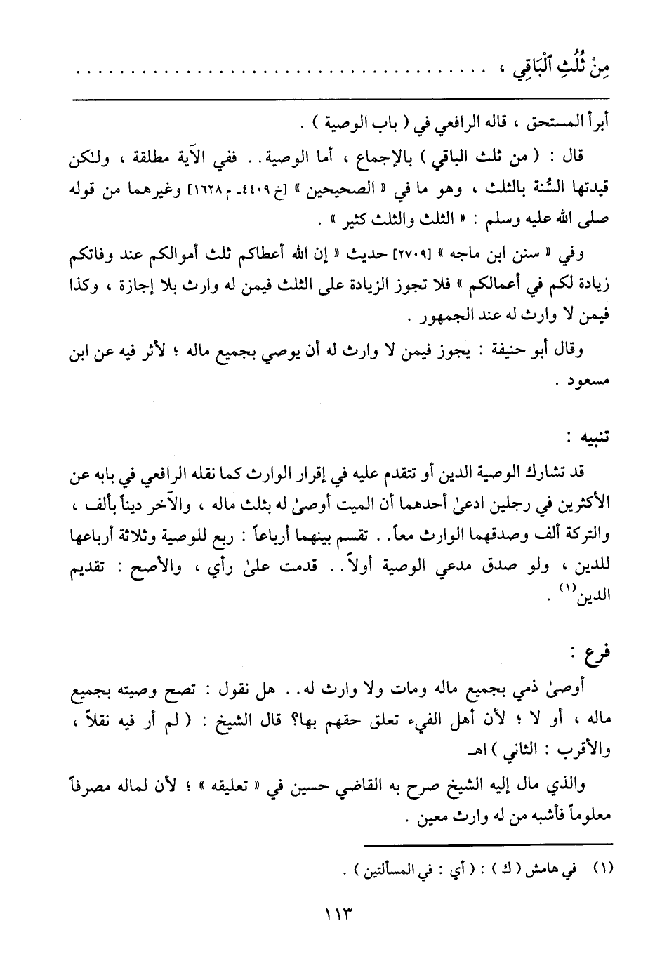 قال: (من ثلث الباقي) بالإجماع، أما الوصية .. ففي الآية مطلقة، ولكن قيدتها السُّنة بالثلث، وهو ما في (الصحيحين) وغيرهما من قوله صلى الله عليه وسلم: (الثلث والثلث كثير).