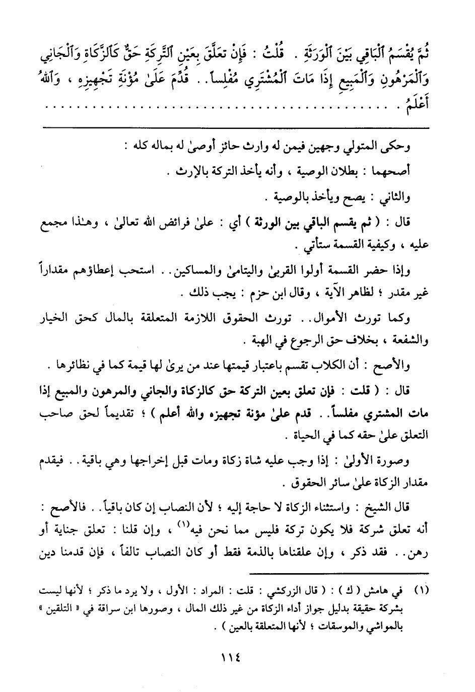 قال الشيخ: واستثناء الزكاة لا حاجة إليه؛ لأن النصاب إن كان باقيًا .. فالأصح: أنه تعلق شركة فلا يكون تركة فليس مما نحن فيه، وإن قلنا: تعلق جناية أو رهن .. فقد ذكر، وإن علقناها بالذمة فقط أو كان النصاب تالفًا، فإن قدمنا دين