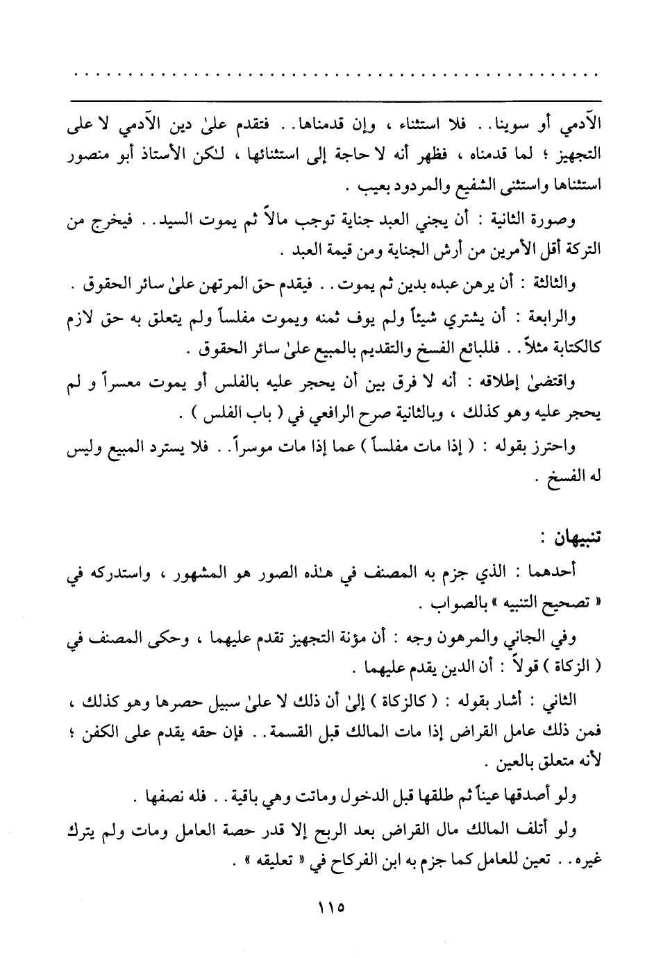 الآدمي أو سوينا .. فلا استثناء، وإن قدمناها .. فتقدم على دين الآدمي لا على التجهيز؛ لما قدمناه، فظهر أنه لا حاجة إلى استثنائها، لكن الأستاذ أبو منصور استثناها واستثنى الشفيع والمردود بعيب.