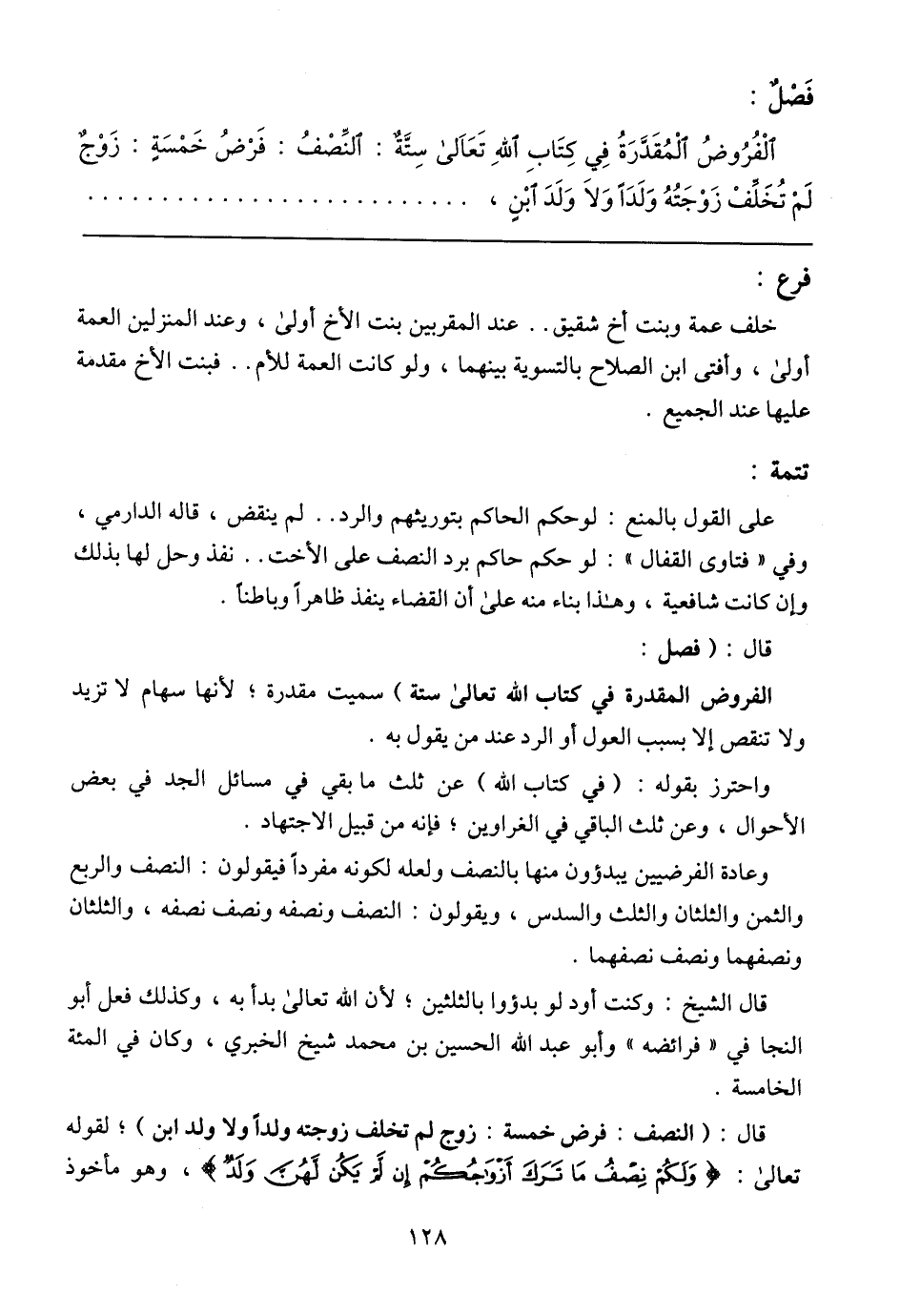 وعادة الفرضيين يبدؤون منها بالنصف ولعله لكونه مفردًا فيقولون: النصف والربع والثمن والثلثان والسدس، ويقولون: النصف ونصفه ونصف نصفه، والثلثان ونصفهما ونصف نصفهما.