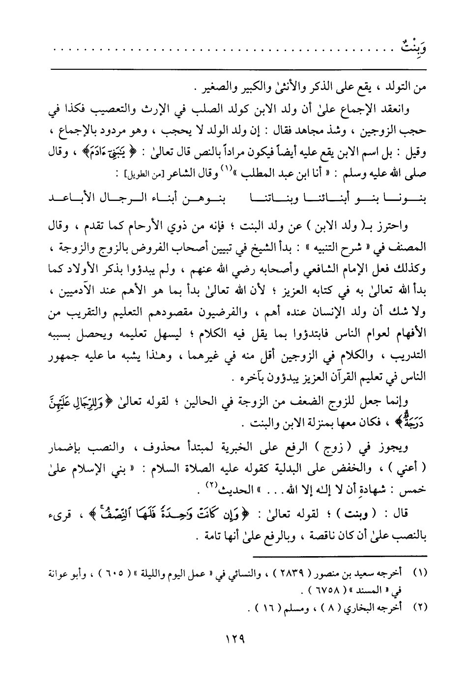 وانعقد الإجماع على أن ولد الابن كولد الصلب في الإرث والتعصيب فكذا في حجب الزوجين، وشذ مجاهد فقال: إن ولد الولد لا يحجب، وهو مردود بالإجماع، وقيل: بل اسم الابن يقع عليه أيضًا فيكون مرادًا بالنص قال تعالى: {يَابَنى آدَمَ}، وقال صلى الله عليه وسلم: (أنا ابن عبد المطلب) وقال الشاعر (من الطويل):