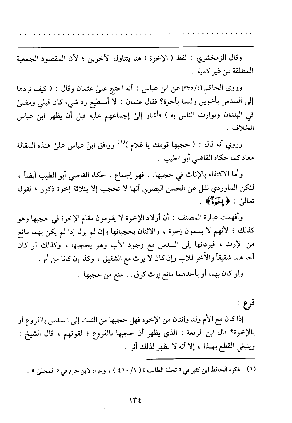 إذا كان مع الأم ولد واثنان من الإخوة فهل حجبها من الثلث إلى السدس بالفروع أو بالإخوة؟ قال ابن الرفعة: الذي يظهر أن حجبها بالفروع؛ لقوتهم، قال الشيخ: وينبغي القطع بهذا، إلا أنه لا يظهر لذلك أثر.