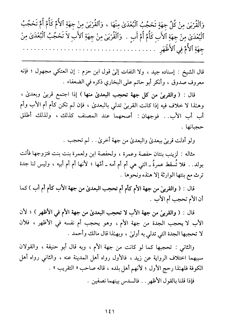 وَالْقُربَى مِنْ كُلِّ جِهَةٍ تَحْجُبُ البُعْدَى مِنهَا، وَالقُرْبَى مِنْ جِهَةِ الأُمِّ كَأُمِّ أُمِّ تَحْجُبُ الْبُعْدَى مِنْ جِهَةِ الأَبِ كَأُمِّ أُمِّ أَبٍ. وَالْقُرْبَى مِنْ جِهَةٍ الأَبِ لاَ تَحْجُبُ الْبُعْدَى مِنْ جِهَةٍ الأُم فِي الأَظْهَرِ