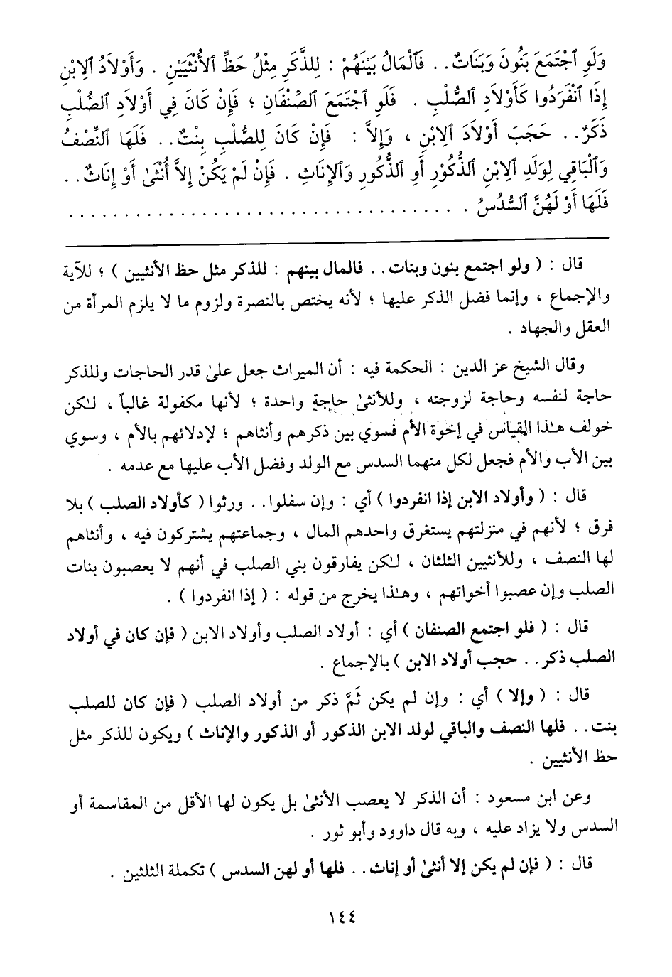 وَلَوِ اجْتَمَعَ بَنُونَ وَبَنَاتٌ .. فَالْمَالُ بَيْنَهُم: لِلذَّكَرِ مِثْلُ حَظِّ الأُنْثَيَيْنِ. وَأَوْلاَدُ الاِبْنِ إِذَا انْفَرَدُوا كَأَوْلاَدِ الصُّلْبِ. فَلَوِ اجْتَمَعَ الصِّنْفَانِ؛ فَإِنْ كَانَ فِي أَوْلاَدِ الصُّلْبِ ذَكَرٌ .. حَجَبَ أَوْلاَدِ الاِبْنِ، وَإِلاَّ: فَإِنْ كَانَ لِلصُّلْبِ بِنْتٌ .. فَلَهَا النِّصْفُ وَالْبَاقِي لِوَلَدِ الاِبْنِ الذُّكُوْرِ أَوِ الذُّكُورِ وَالإِنَاثِ. فَإِنْ لَمْ يَكُنْ إِلاَّ أُنْثَى أَوْ إِنَاث .. فَلَهَا أَوْ لَهُنَّ السُّدُسُ