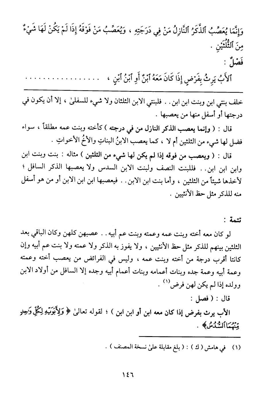 قال: (وإنما يعصب الذكر النازل من في درجته) كأخته وبنت عمه مطلقًا، سواء فضل لها شيء من الثلثين أم لا، كما يعصب الابنُ البناتِ والأخُ الأخواتِ.