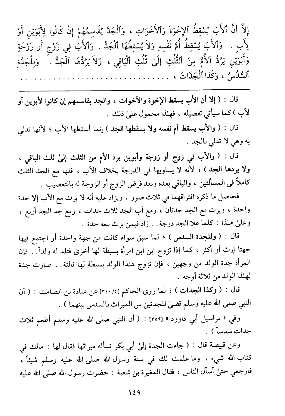 إِلاَّ أنَّ الأّبّ يُسْقِطُ الإِخْوَةَ وَالأَخَوَاتِ، وَالْجَدَّ يُقَاسِمُهُمْ إِنْ كَانُوا لأَبَوَيْنِ أَوْ لأَبٍ. وَالأَبَ يُسْقِطُ أَمْ نَفْسِهِ وَلاَ يُسْقِطُهَا الْجَدُّ. وَالأَبَ فِي زَوْجٍ أَو زَوْجَةٍ وَأَبَوَيْنِ يَرُدُّ الأُمْ مِنَ الثُّلُثِ إِلَى ثُلُثِ الْبَاقِي، وَلاَ يَرُدُّهَا الْجَدُّ. وَلِلْجَدَّةِ السُّدُسُ، وَكَذا الْجَدَّاتُ،