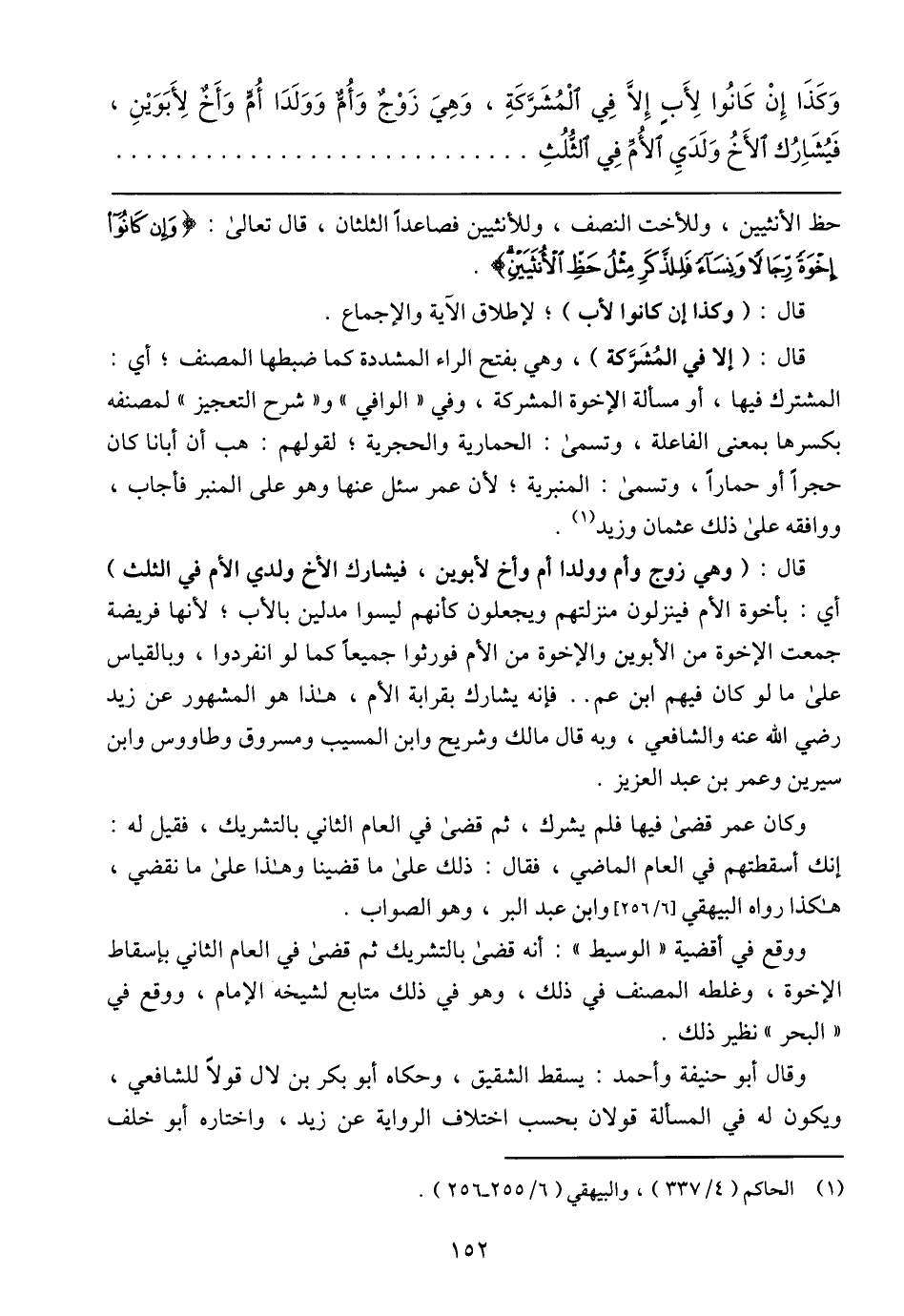 قال: (إلا في المُشَرَّكة)، وهي بفتح الراء المشددة كما ضبطها المصنف؛ أي: المشترك فيها، أو مسألة الإخوة المشركة، وفي (الوافي) و (شرح التعجيز) لمصنفه بكسرها بمعنى الفاعلة، وتسمى: الحمارية والحجرية؛ لقولهم: هب أن أبانا كان حجرًا أو حمارًا، وتسمى: المنبرية؛ لأن عمر سئل عنها وهو على المنبر فأجاب، ووافقه على ذلك عثمان وزيد.