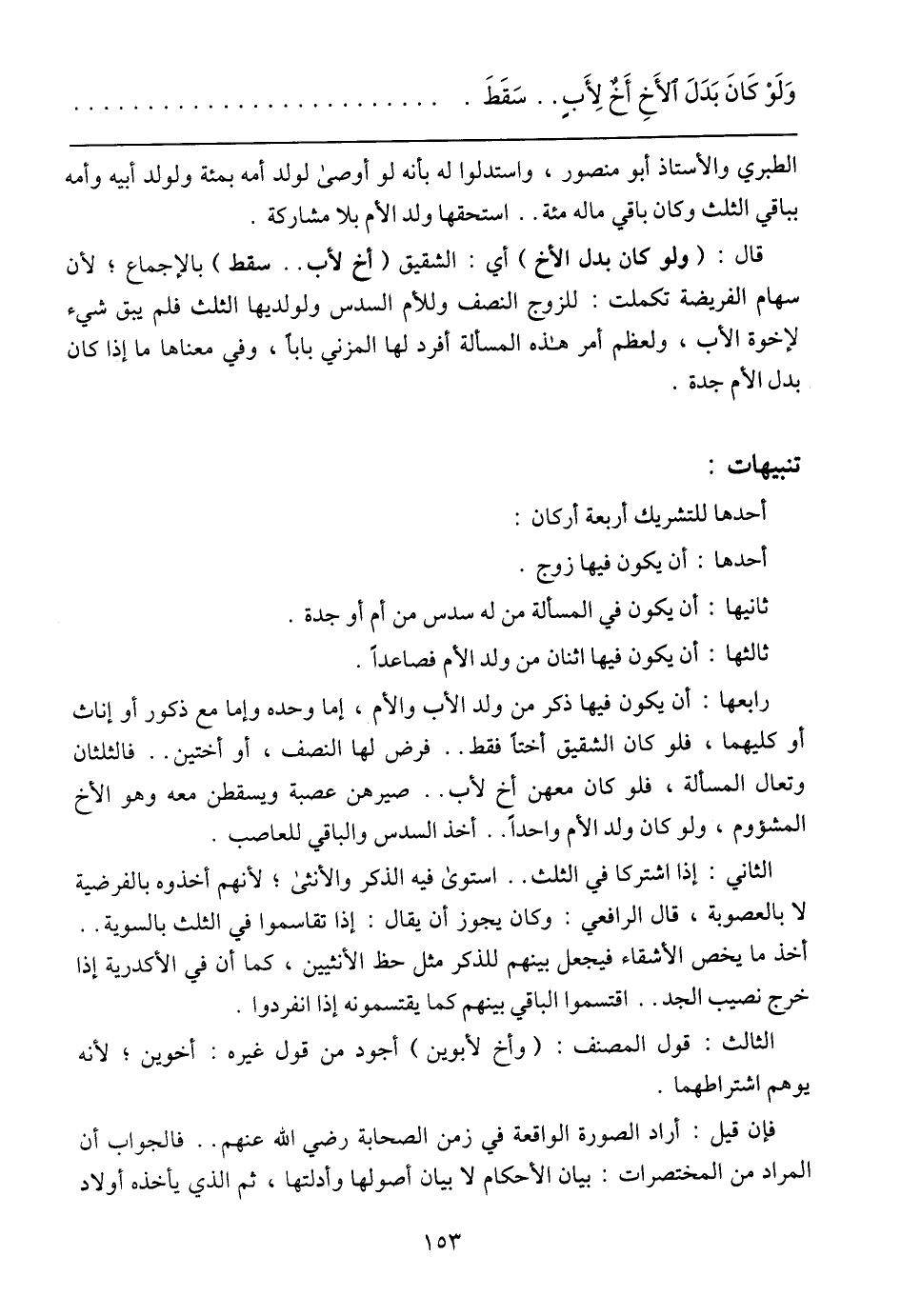 رابعها: أن يكون فيها ذكر من ولد الأب والأم، إما وحده وإما مع ذكور أو إناث أو كليهما، فلو كان الشقيق أختًا فقط .. فرض لها النصف، أو أختين .. فالثلثان وتعال المسألة، فلو كان معهن أخ لأب .. صيرهن عصبة ويسقطن معه وهو الأخ المشؤوم، ولو كان ولد الأم واحدًا .. أخذ السدس والباقي للعاصب.