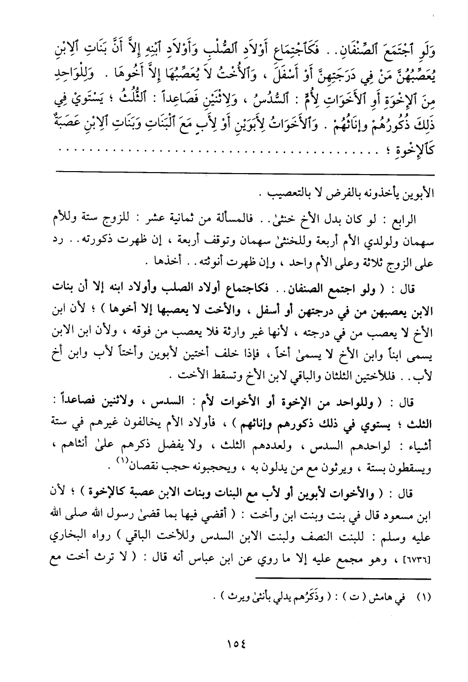 وَلَوِ اجْتَمَعَ الصِّنْفَانِ .. فَكَاجْتِمَاعِ أَوْلاَدِ الصُّلْبِ وَأَوْلاَدِ ابْنِهِ إِلاَّ أَنَّ بَنَاتِ الاِبْنِ يُعَصِّبُهُنَّ مَنْ فِي دَرَجَتِهِنَّ أَوْ أَسْفَلَّ، وَالأُخْتُ لاَ يُعَصُبُهَا إِلاَّ أَخُوهَا. وَلِلْوَاحِدِ مِنَ الإِخْوَةِ أَوِ الأَخَوَاتِ لأُمٍّ: السُّدُسُ، وَلاثْنَيْنِ فَصَاعِدًا: الثُّلُثُ؛ يَسْتَويْ فِي ذَلِكَ ذُكُورُهُمْ وإِنَاثُهُمْ. وَالأَخَوَاتُ لأَبَوَيْنِ أَوْ لأَبٍ مَعَ الْبَنَاتِ وَبَنَاتِ الاِبْنِ عَصَبَةٌ كَالإِخْوةِ؛