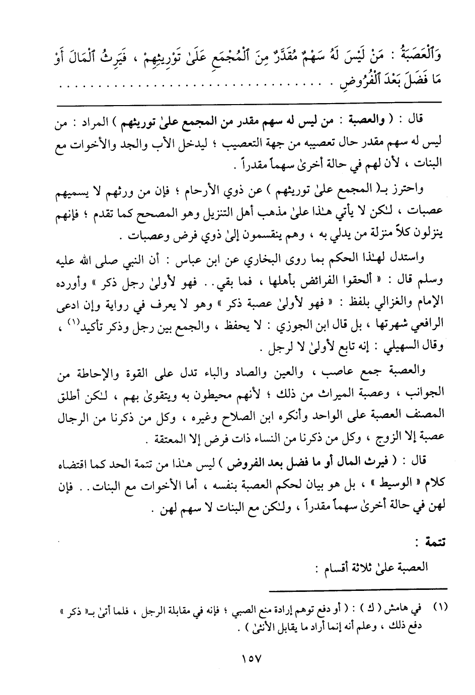 وَالْعَصَبَةُ: مَنْ لَيْسَ لَهُ سَهْمٌ مُقَدَّرٌ مِنْ المْجُمَعِ عَلَى تَوْرِيثهِمْ، فَيرِثُ الْمَالَ أَوْ مَا فَضَلَ بَعْدَ الفُرُوضِ
