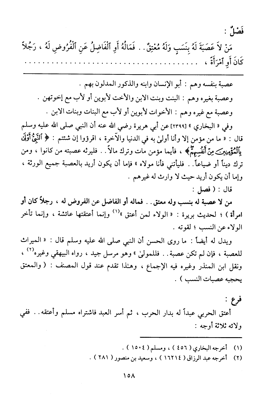 مَنْ لاَ عَصَبَةَ لَهُ بِنْسَبِ وَلَهُ مُعْتِقً .. فَمَالُهُ أَوِ الْفَاضِلُ عَنِ الْفُرُوضِ لَهُ، رَجُلاً كَانَ أَوِ امْرَأَةً،