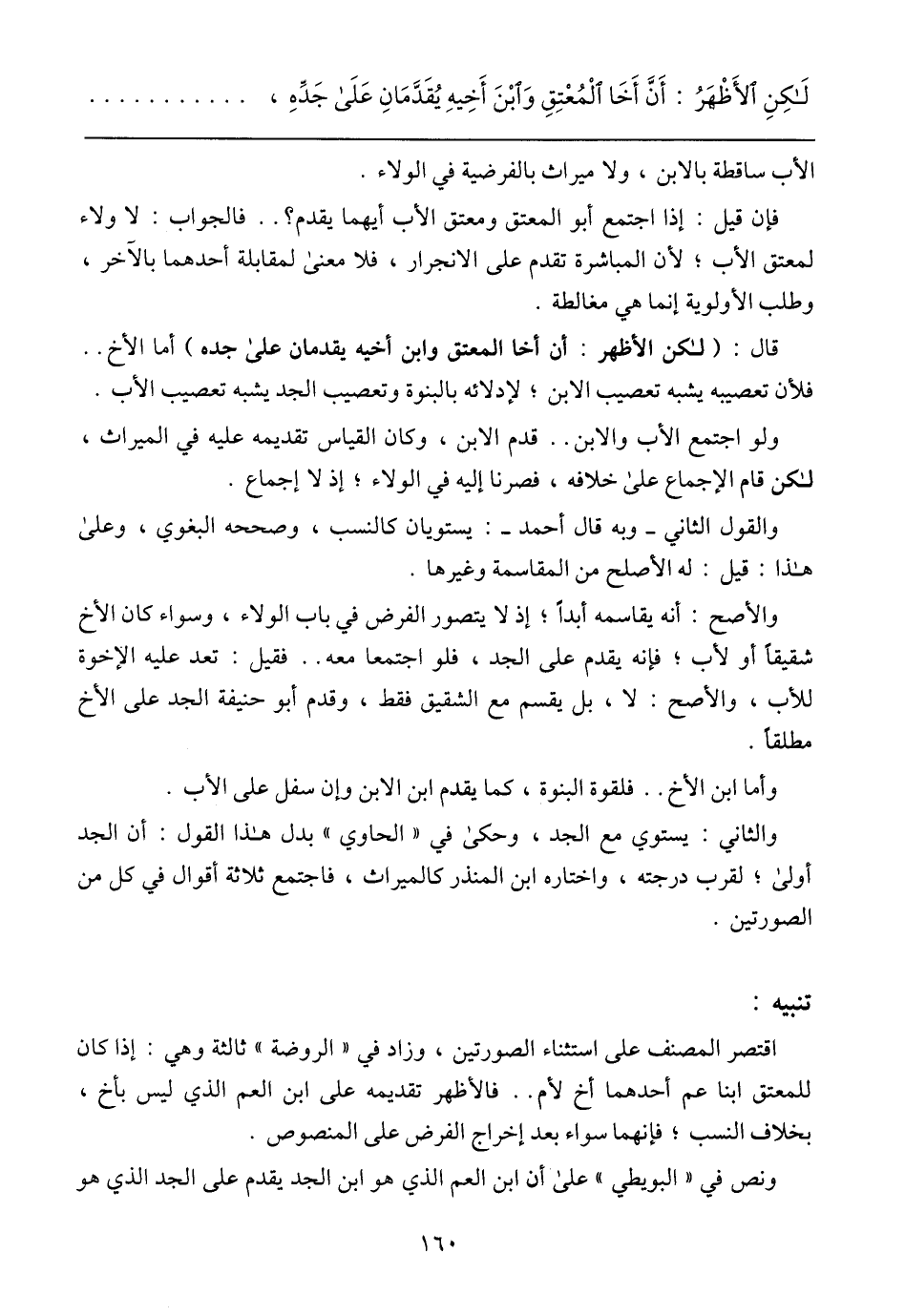 اقتصر المصنف على استثناء الصورتين، وزاد في (الروضة) ثالثة وهي: إذا كان للمعتق ابنا عم أحدهما أخ لأم .. فالأظهر تقديمه على ابن العم الذي ليس بأخ، بخلاف النسب؛ فإنهما سواء بعد إخراج الفرض على المنصوص.