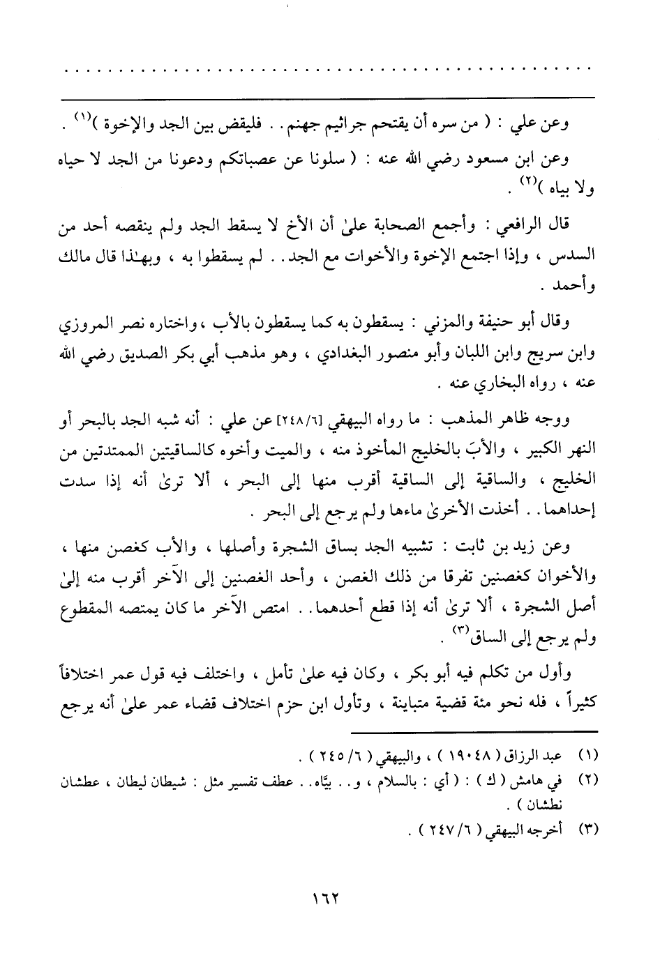 وعن زيد بن ثابت: تشبيه الجد بساق الشجرة وأصلها، والأب كغصن منها، والأخوان كغصنين تفرقا من ذلك الغصن، وأحد الغصنين إلى الآخر أقرب منه إلى أصل الشجرة، ألا ترى أنه إذا قطع أحدهما .. امتص الآخر ما كان يمتصه المقطوع ولم يرجع إلى الساق.