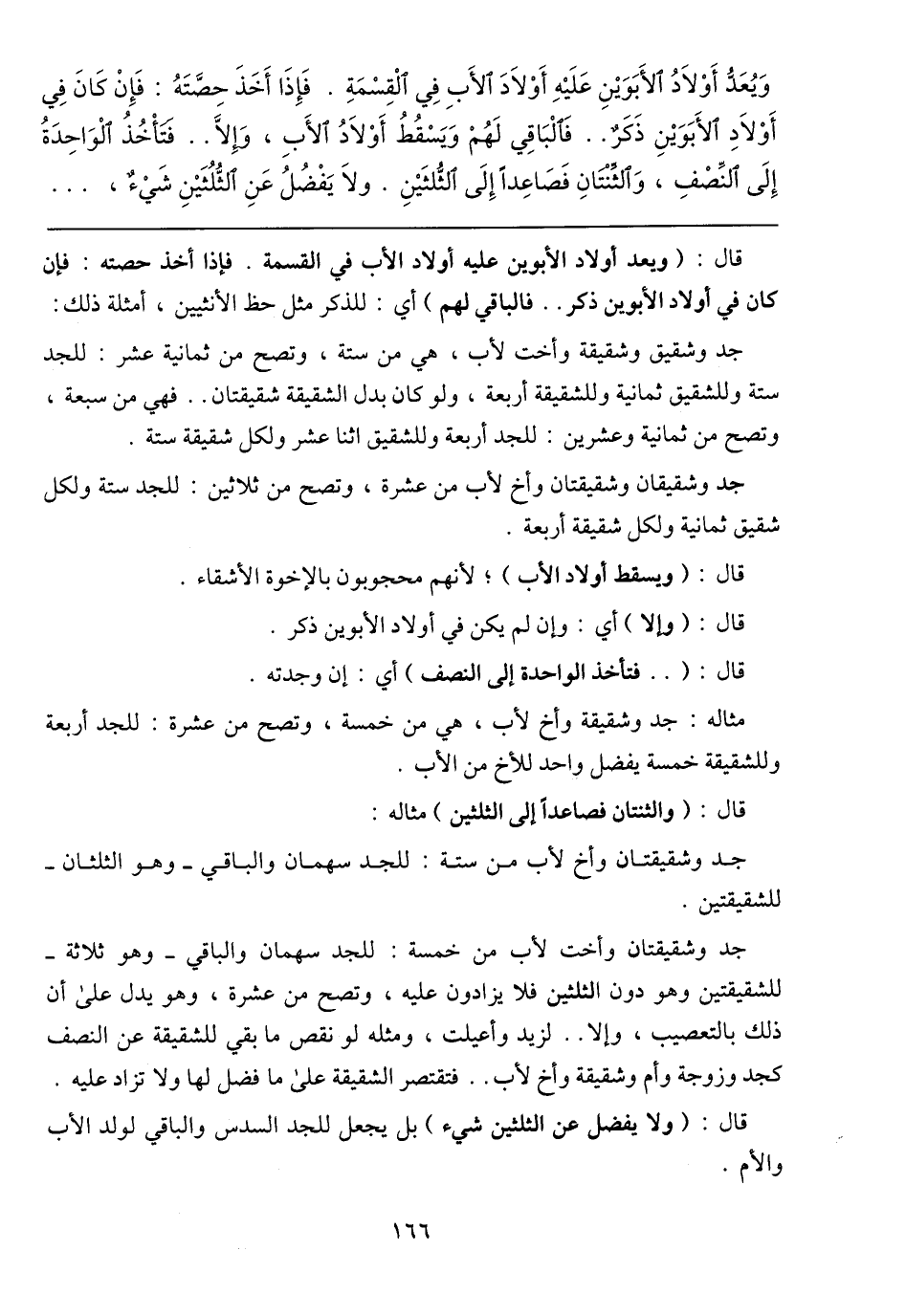 قال: (ويعد أولاد الأبوين عليه أولاد الأب في القسمة. فإذا أخذ حصته: فإن كان في أولاد الأبوين ذكر .. فالباقي لهم) أي: للذكر مثل حظ الأنثيين، أمثلة ذلك: جد وشقيق وشقيقة وأخت لأب، هي من ستة، وتصح من ثمانية عشر: للجد ستة وللشقيق ثمانية وللشقيقة أربعة، ولو كان بدل الشقيقة شقيقتان .. فهي من سبعة، وتصح من ثمانية وعشرين: للجد أربعة وللشقيق اثنا عشر ولكل شقيقة ستة.