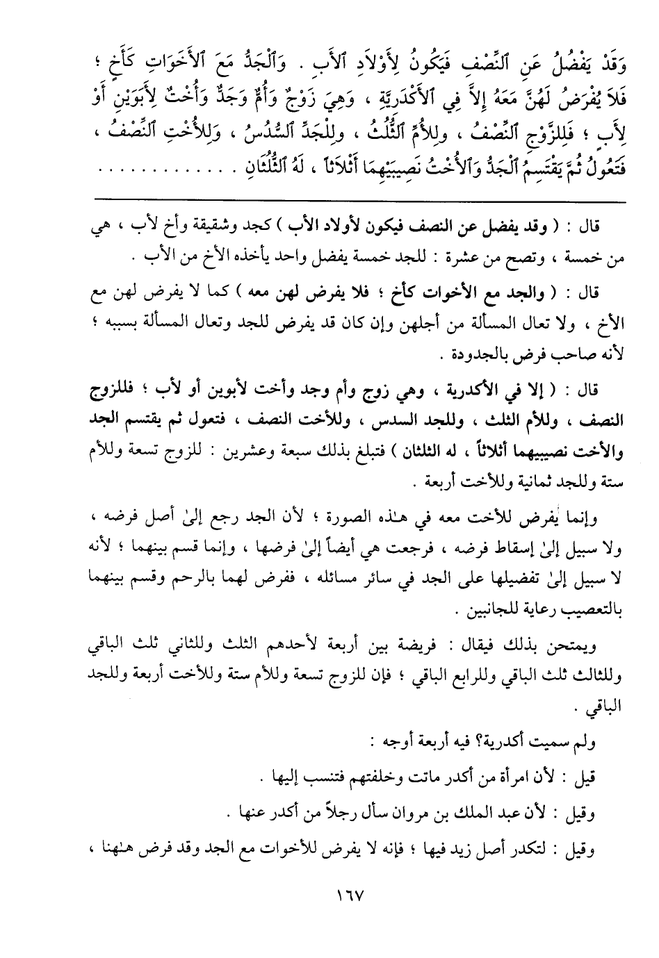قال: (إلا في الأكدرية، وهي زوج وأم وجد وأخت لأبوين أو لأب، فللزوج النصف، وللأم الثلث، وللجد السدس، وللأخت النصف، فتعول ثم يقتسم الجد والأخت نصيبيهما أثلاثًا، له الثلثان) فتبلغ بذلك سبعة وعشرين: للزوج تسعة وللأم ستة وللجد ثمانية وللأخت أربعة.