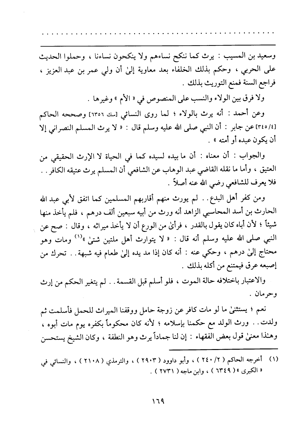 وسعيد بن المسيب: يرث كما ننكح نساءهم ولا ينكحون نساءنا، وحملوا الحديث على الحربي، وحكم بذلك الخلفاء بعد معاوية إلى أن ولي عمر بن عبد العزيز، فراجع السنة فمنع التوريث بذلك.