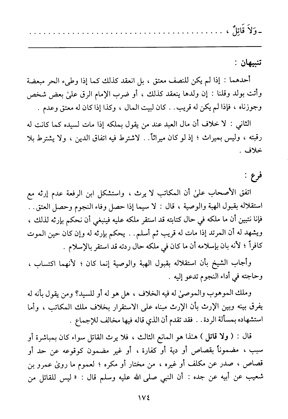 اتفق الأصحاب على أن المكاتب لا يرث، واستشكل ابن الرفعة عدم إرثه مع استقلاله بقبول الهبة والوصية، قال: لا سيما إذا حصل وفاء النجوم وحصل العتق .. فإنا نتبين أن ما ملكه في حال كتابته قد استقر ملكه عليه فينبغي أن نحكم بإرثه لذلك، ويشهد له أن المرتد إذا مات له قريب ثم أسلم .. يحكم بإرثه له وإن كان حين الموت كافرًا؛ لأنه بان بإسلامه أن ما كان في ملكه حال ردته قد استقر بالإسلام.