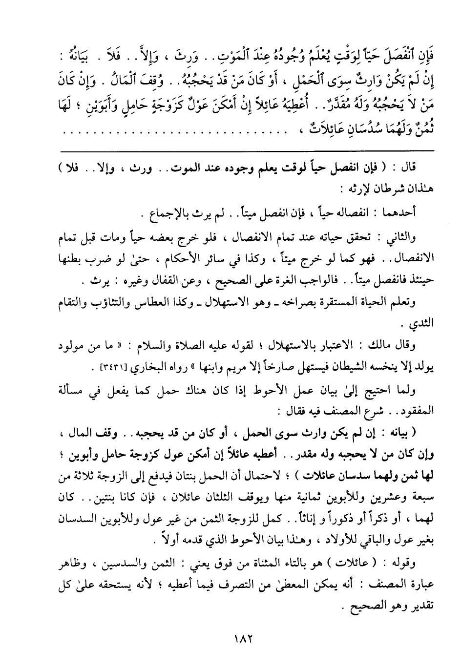 فَإِنْ انْفَصَلَ حَيّاً لِوَقْتٍ يُعْلَمُ وُجُودهُ عِنْدَ الْمَوْتِ .. وَرِثَ، وَإِلاَّ .. فَلاَ. بَيَانُهُ: إِنْ لَمْ يَكُنْ وَارِثٌ سِوَى الْحَمْلِ، أَوْ كَانَ مَنْ قَدْ يَحْجُبُهُ .. وُقِفَ الْمَالُ. وَإِنْ كَانَ مَنْ لاَ يَحْجُبُهُ وَلَهُ مُقَدَّرٌ .. أُعْطِيَهُ عَائِلاً إِنْ أَمْكَنَ عَوْلٌ كَزَوْجَةٍ حَامِلٍ وَأَبَوَيْنِ؛ لَهَا ثُمُنٌ وَلَهُمَا سُدُسَانِ عَائِلاَتٌ،