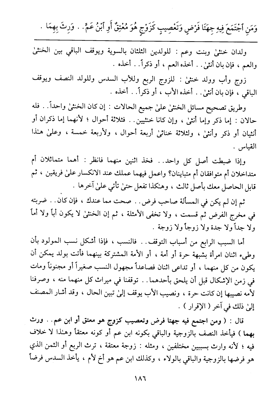 قال: (ومن اجتمع فيها جهتا فرض وتعصيب كزوج هو معتق أو ابن عم .. ورث بهما) فيأخذ النصف بالزوجية والباقي بكونه ابن عم أو كونه معتقًا وهذا لا خلاف فيه؛ لأنه وارث بسببين مختلفين، ومثله: زوجة معتقة، ترث الربع أو الثمن الذي هو فرضها بالزوجية والباقي بالولاء، وكذلك ابن عم هو أخ لأم، يأخذ السدس فرضًا