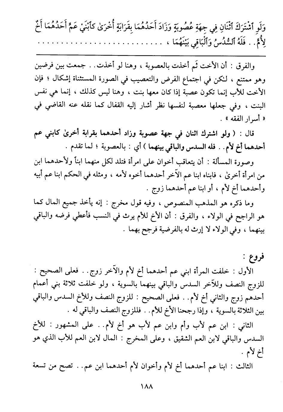 وَلَوِ اشْتَرَكَ اثْنَانِ فِي جِهَةِ عُصُوبَةٍ وَزَادَ أَحَدُهُمَا بِقَرَابَةٍ أُخْرَى كابْنَيْ عَمٍّ أَحَدُهُمَا أَخٌ لِأُمٍّ .. فَلَهُ السُّدُسُ وَالْبَاقِي بَيْنَهُمَا،