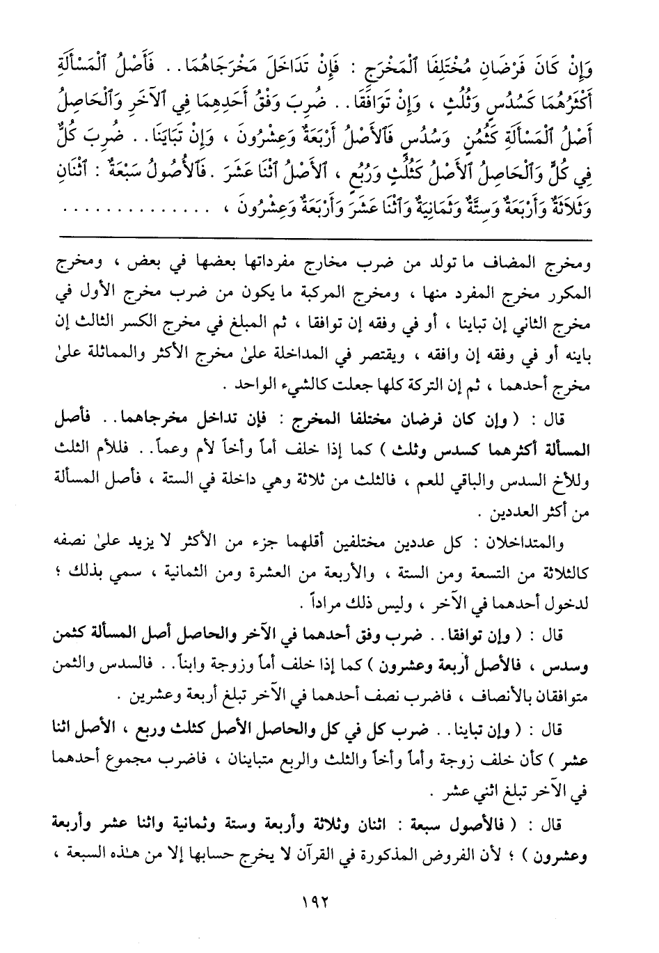 وَإِنْ كَانَ فَرْضَانِ مُخْتَلِفَا الْمَخْرَجِ: فَإِنْ تَدَاخَلَ مَخْرَجَاهُمَا .. فَأَصْلُ الْمَسْأَلِة أَكْثَرُهُمَا كَسُدُسٍ وَثُلُثٍ، وَإِنْ تَوَافَقَا .. ضُرِبَ وَفْقُ أَحَدِهِمَا فِي الآخَرِ وَالْحَاصِلُ أَصْلُ الْمَسْأَلَةِ كَثُمُنٍ وَسُدُس فَالأَصْلُ أَرْبَعَةٌ وَعِشْرُونَ، وَإِنْ تَبَايَنَا .. ضُرِبَ كُلٌّ فِي كُلٍّ وَالْحَاصِلُ الأَصْلُ كَثُلُثٍ وَرُبُعٍ، الأَصْلُ اثْنَا عَشَرَ. فَالأُصُولُ سَبْعَةٌ: اثْنَانِ وَثَلَاثَةٌ وَأَرْبَعَةٌ وَسِتَةٌ وَثَمَانِيَةٌ وَاثْنَا عَشَرَ وَأَرْبَعَةٌ وَعِشْرُونَ،