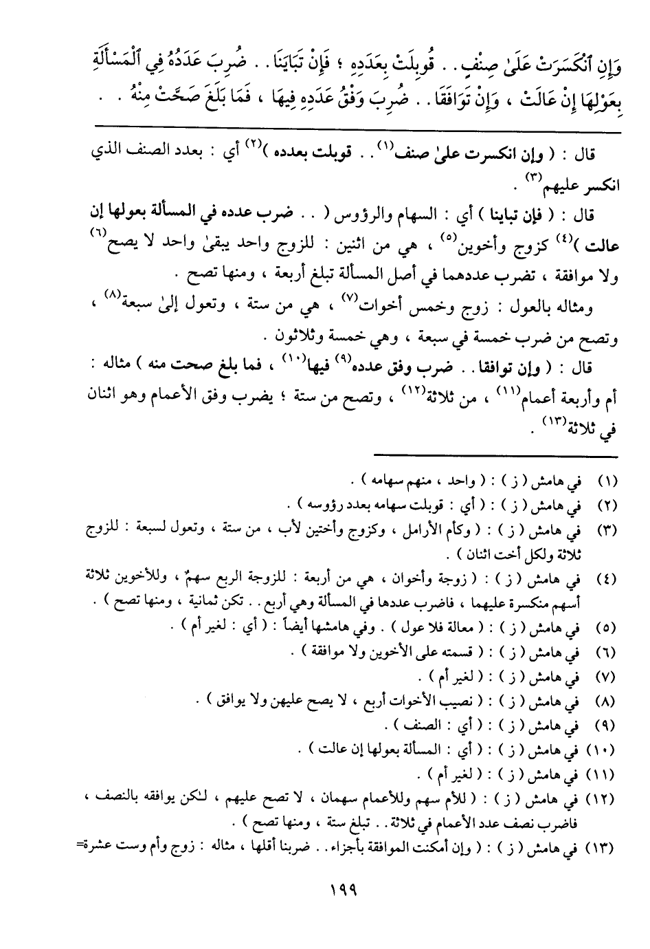 وَإِنِ انْكَسَرَتْ عَلَى صِنْفٍ .. قُوبِلَتْ بِعَدَدِهِ؛ فَإِنْ تَبَايَنَا .. ضُرِبَ عَدَدُهُ فِي الْمَسْأَلَةِ بِعَوْلِهَا إِنْ عَالَتْ، وَإِنْ تَوَافَقَا .. ضُرِبَ وَفْقُ عَدَدِهِ فِيهَا، فَمَا بَلَغَ صَحَّتْ مِنْهُ ..