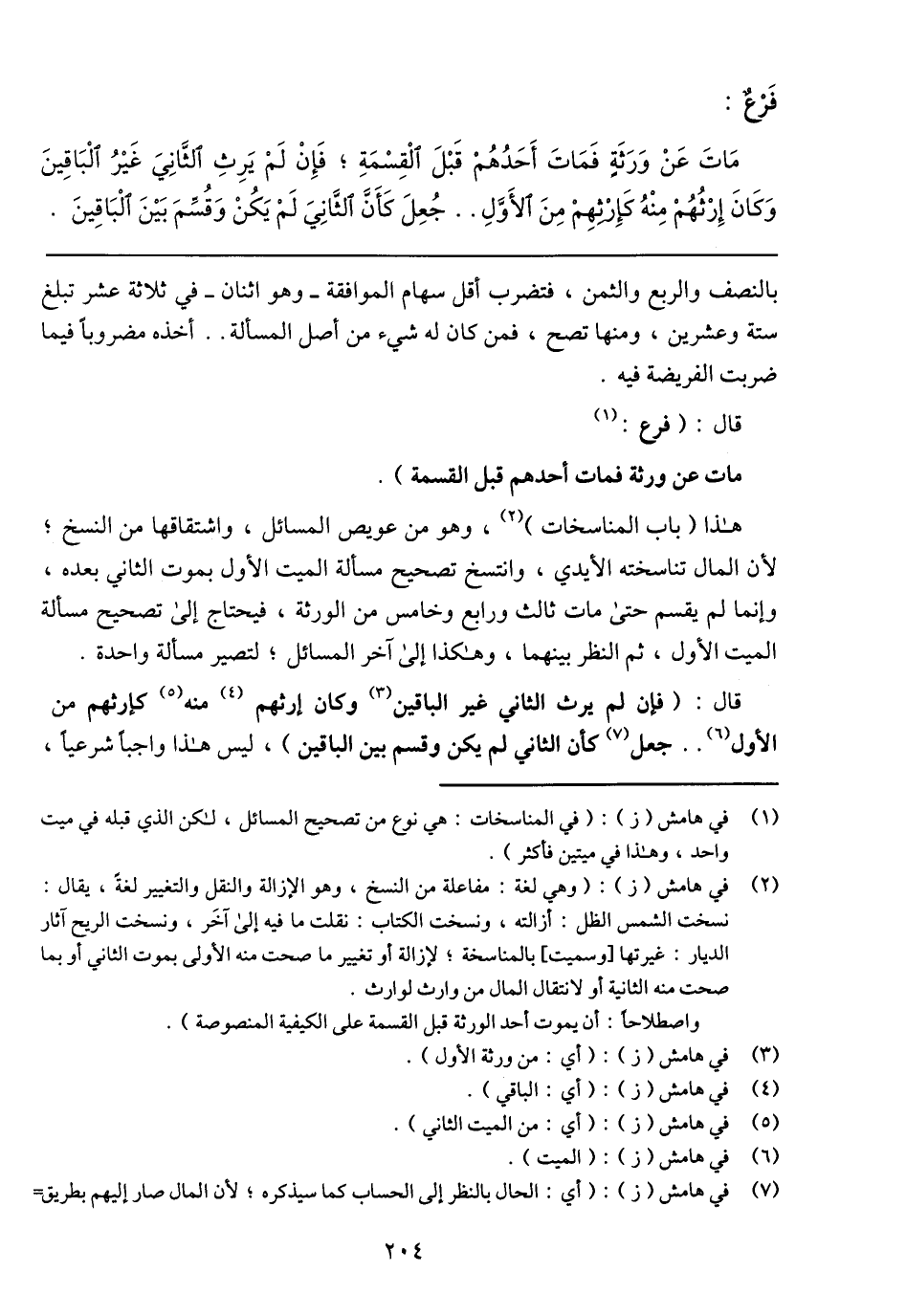 هذا (باب المناسخات)، وهو من عويص المسائل، واشتقاقها من النسخ؛ لأن المال تناسخته الأيدي، وانتسخ تصحيح مسألة الميت الأول بموت الثاني بعده، وإنما لم يقسم حتى مات ثالث ورابع وخامس من الورثة، فيحتاج إلى تصحيح مسألة الميت الأول، ثم النظر بينهما، وهكذا إلى آخر المسائل؛ لتصير مسألة واحدة.