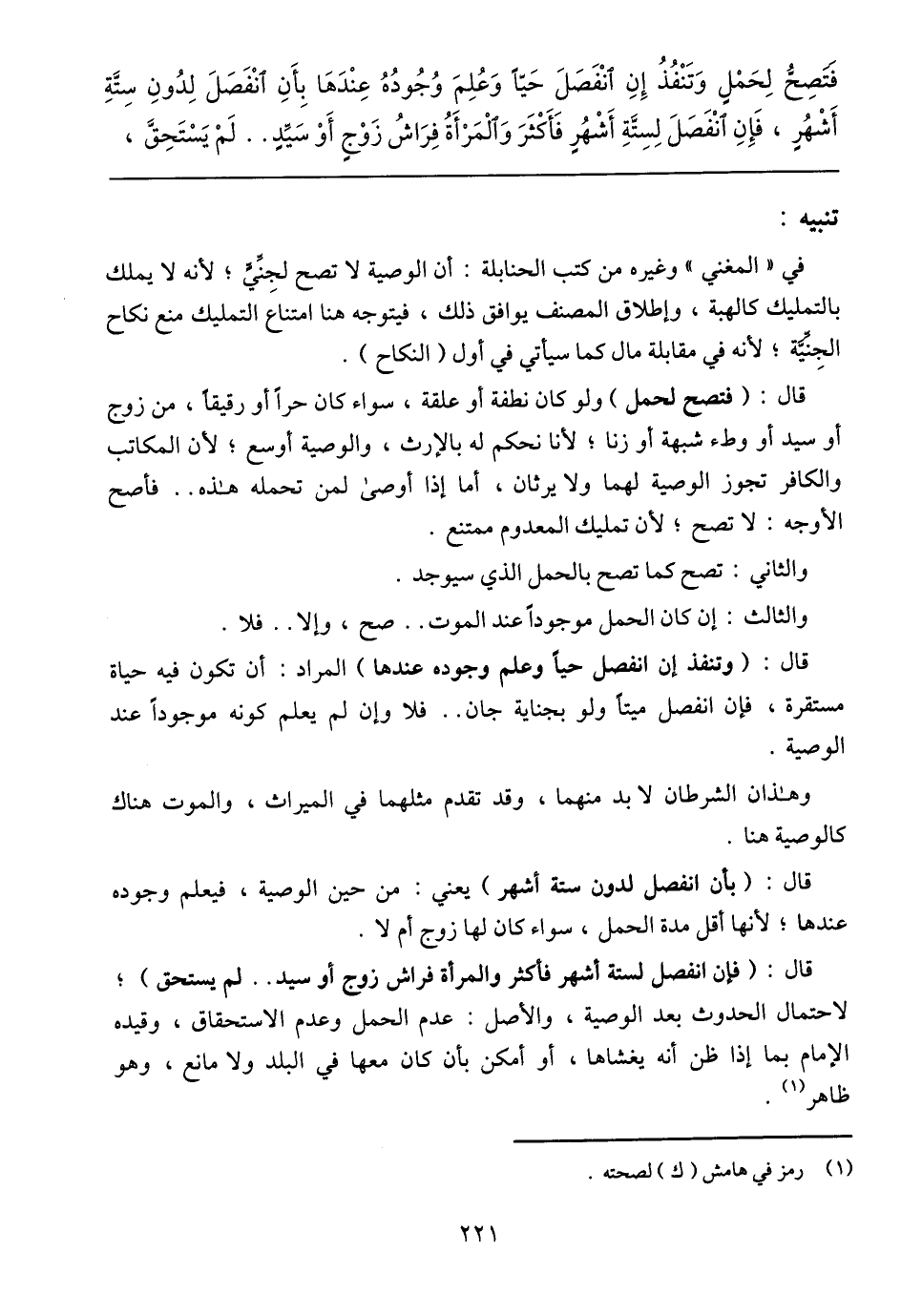 قال: (وتنفذ إن انفصل حيًا وعلم وجوده عندها) المراد: أن تكون فيه حياة مستقرة، فإن انفصل ميتًا ولو بجناية جان .. فلا وإن لم يعلم كونه موجودًا عند الوصية.