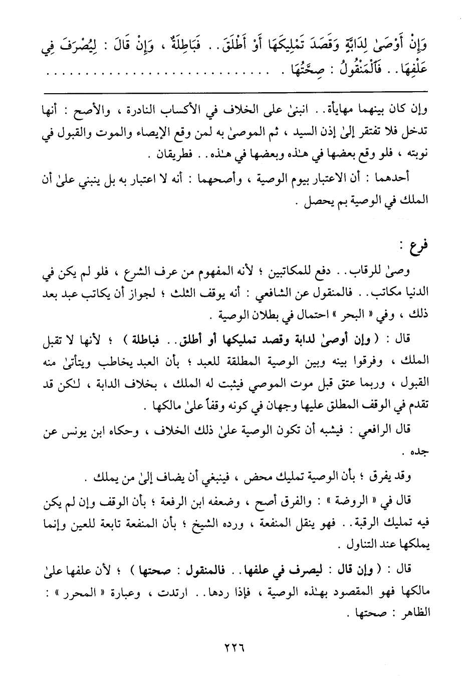 وَإِنْ أَوْصَى لَدَابَّةٍ وَقَصَدَ تَمْلِيكَهَا أَوْ أَطْلَقَ .. فَبَاطِلَةٌ، وَإِنْ قَالَ: لِيُصْرَفَ فِي عَلْفِهَا .. فَالْمَنْقُولُ: صِحَّتُهَا