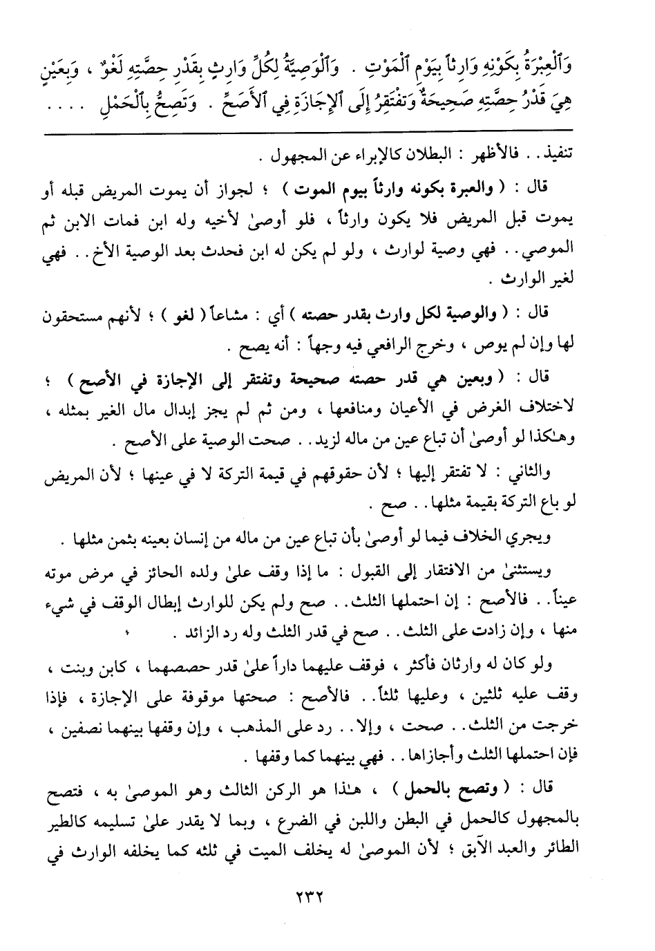 وَالْعِبْرَةُ بِكَوْنِهِ وَارِثًا بِيَوْم الْمَوْتِ .. وَالْوَصِيَّةُ لِكُلِّ وَارِثٍ بِقَدْرِ حِصَّتِهِ لَغْوٌ، وَبِعَيْنٍ هِيَ قَدْرُ حِصَّتِهِ صَحِيحَةٌ وَتفْتَقِرُ إِلَى الإِجَازَةِ فِي الأَصَحِّ. وَتَصِحُّ بِالْحَمْلِ