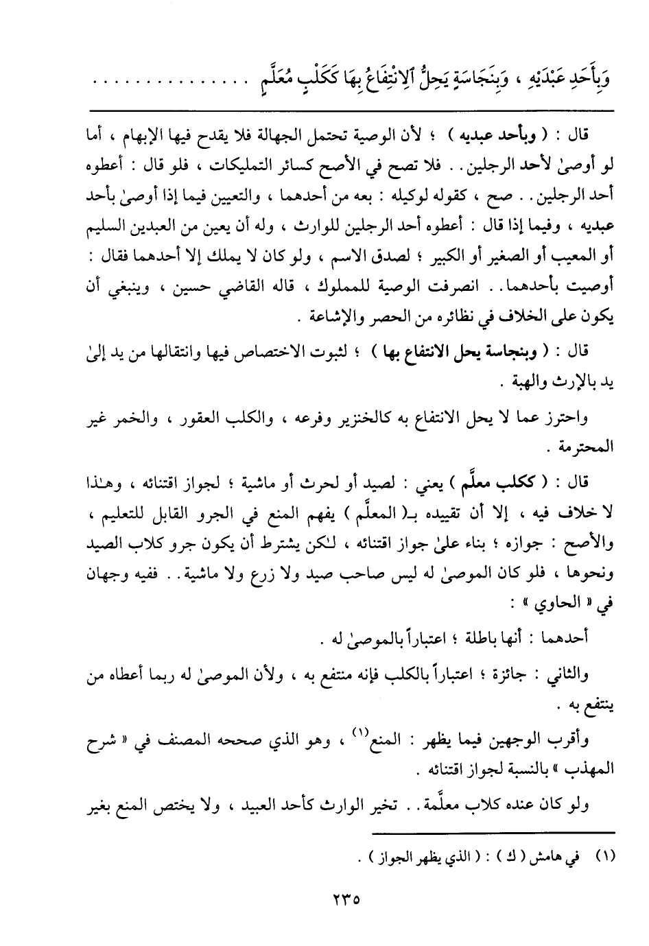 قال: (ككلب معلَّم) يعني: لصيد أو لحرث أو ماشية؛ لجواز اقتنائه، وهذا لا خلاف فيه، إلا من تقييده بـ (المعلَّم) يفهم المنع في الجرو القابل للتعليم، والأصح: جوازه؛ بناء على جواز اقتنائه، لكن يشترط أن يكون جرو كلاب الصيد ونحوها، فلو كان الموصى له ليس صاحب صيد ولا زرع ولا ماشية .. ففيه وجهان في (الحاوي):