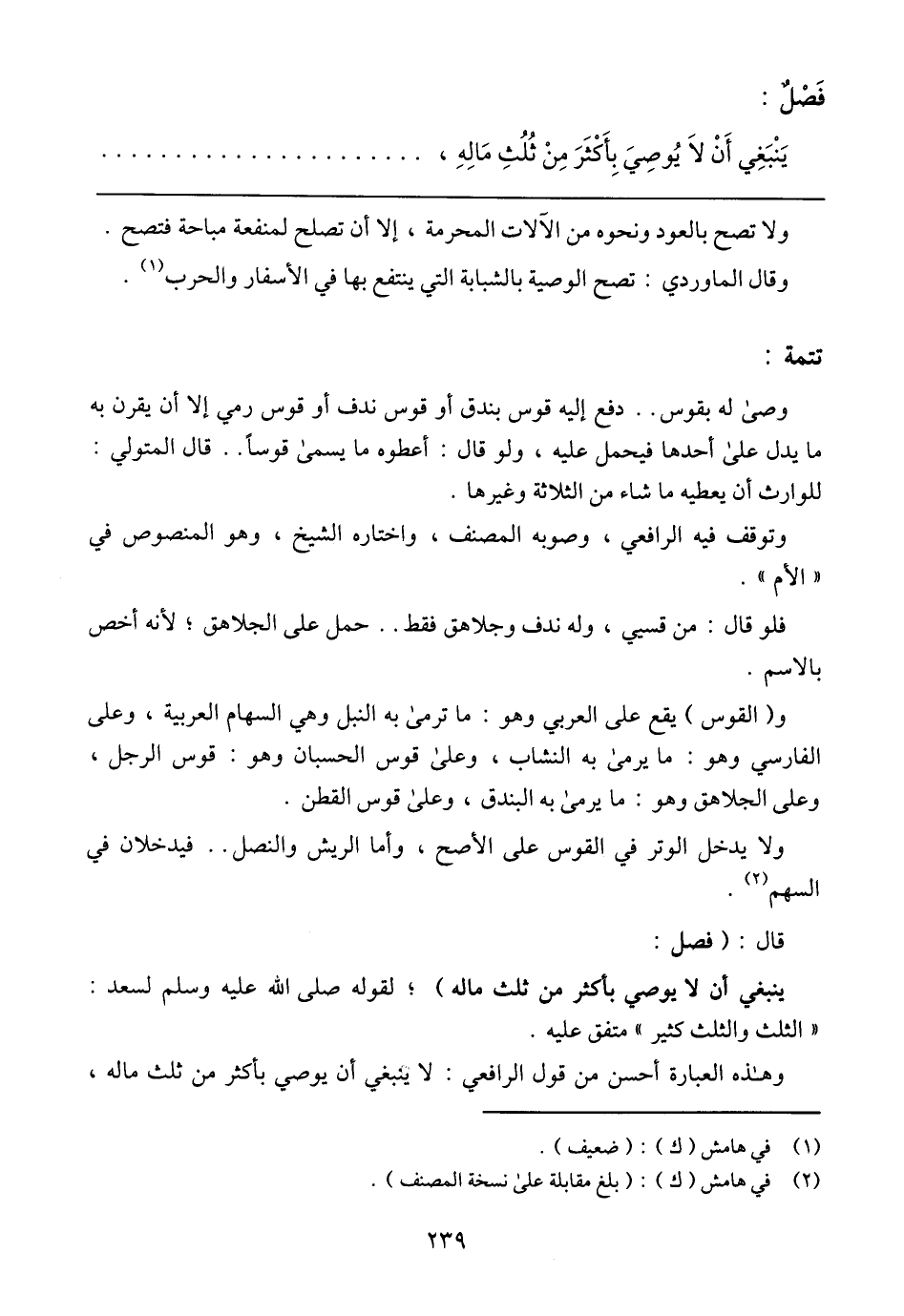 يَنْبَغِي أَنْ لَا يُوصِيَ بِأَكْثَرَ مِنْ ثُلُثِ مَالِهِ،