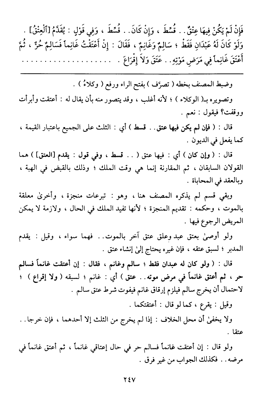 وتصويره بـ (الوكلاء)؛ لأنه أغلب، وقد يتصور منه بأن يقال له: أعتقت وأبرأت ووقفت؟ فيقول: نعم.