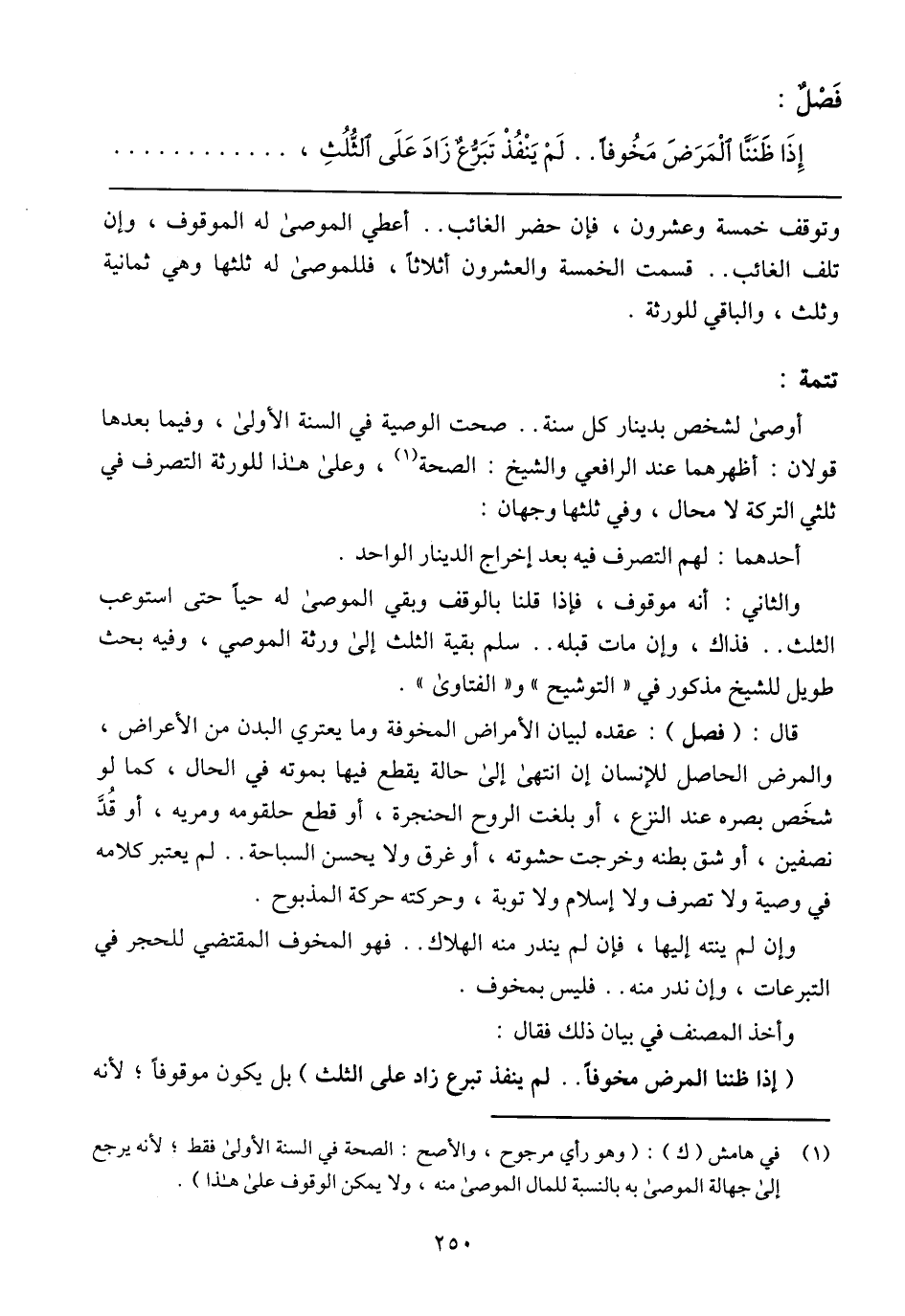 قال: (فصل): عقده لبيان الأمراض المخوفة وما يعتري البدن من الأعراض، والمرض الحاصل للإنسان إن انتهى إلى حالة يقطع فيها بموته في الحال، كما لو شخص بصره عند النزع، أو بلغت الروح الحنجرة، أو قطع حلقومه ومريه، أو قد نصفين، أو شق بطنه وخرجت حشوته، أو غرق ولا يحسن السباحة .. لم يعتبر كلامه في وصية ولا تصرف ولا إسلام ولا توبة، وحركته حركة المذبوح.
