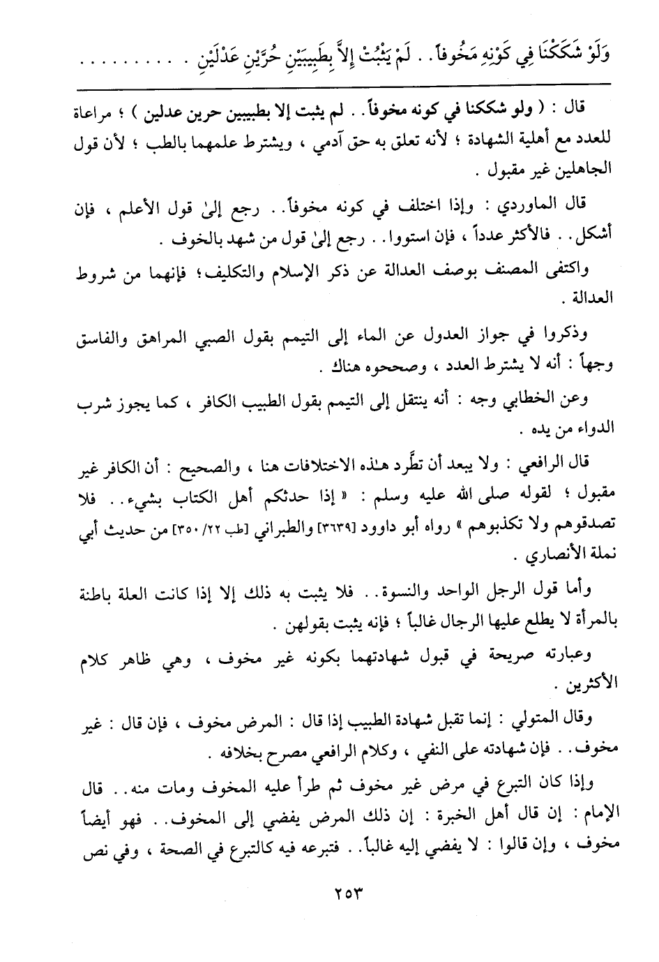 قال: (ولو شككنا في كونه مخوفًا .. لم يثبت إلا بطبيبين حرين عدلين)؛ مراعاة للعدد مع أهلية الشهادة؛ لأنه تعلق به حق آدمي، ويشترط علمهما بالطب؛ لأن قول الجاهلين غير مقبول.