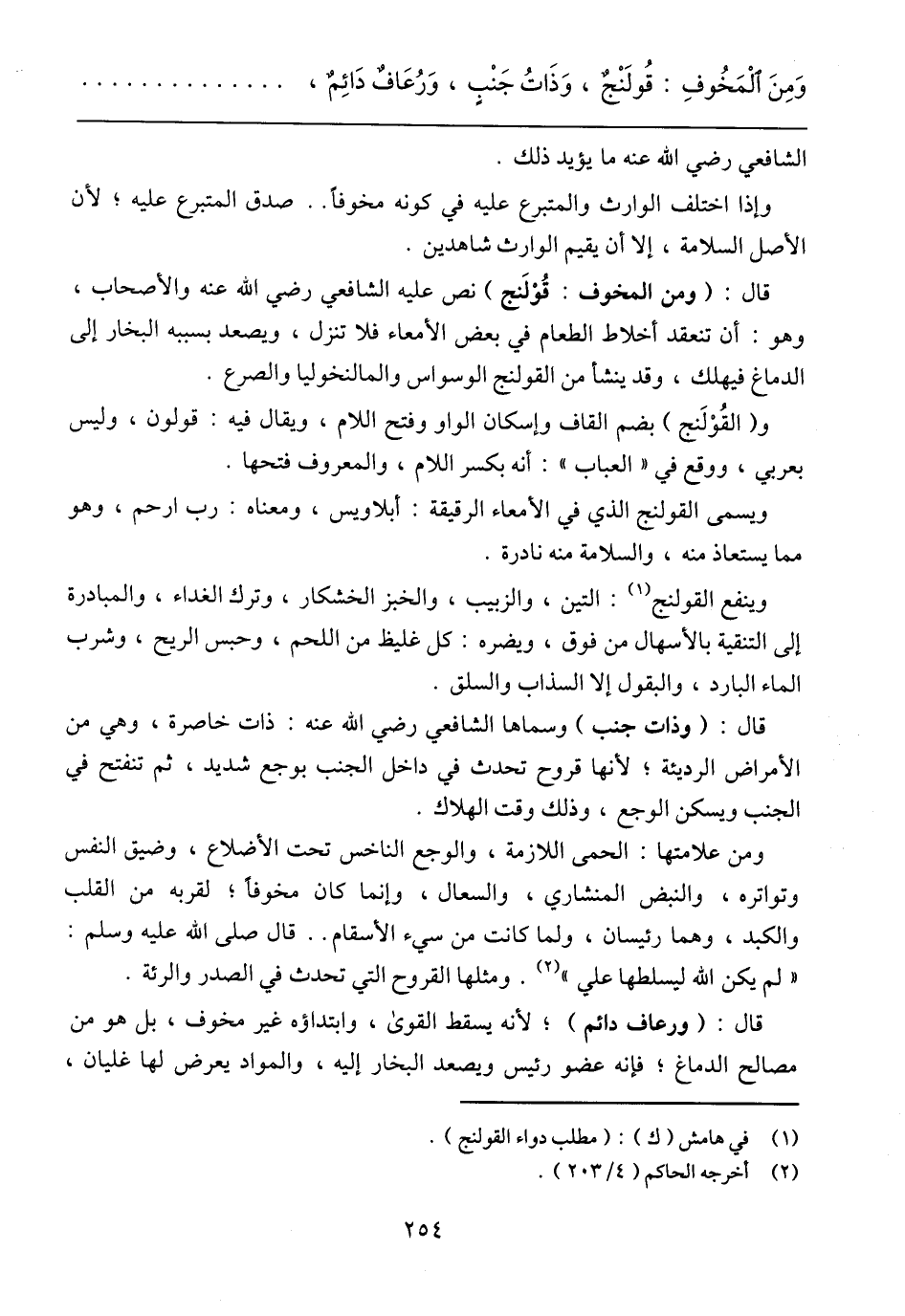 وَمِنَ الْمَخُوفِ: قُولَنْجٌ، وَذَاتُ جَنْبٍ، وَرُعَافٌ دَائِمٌ،